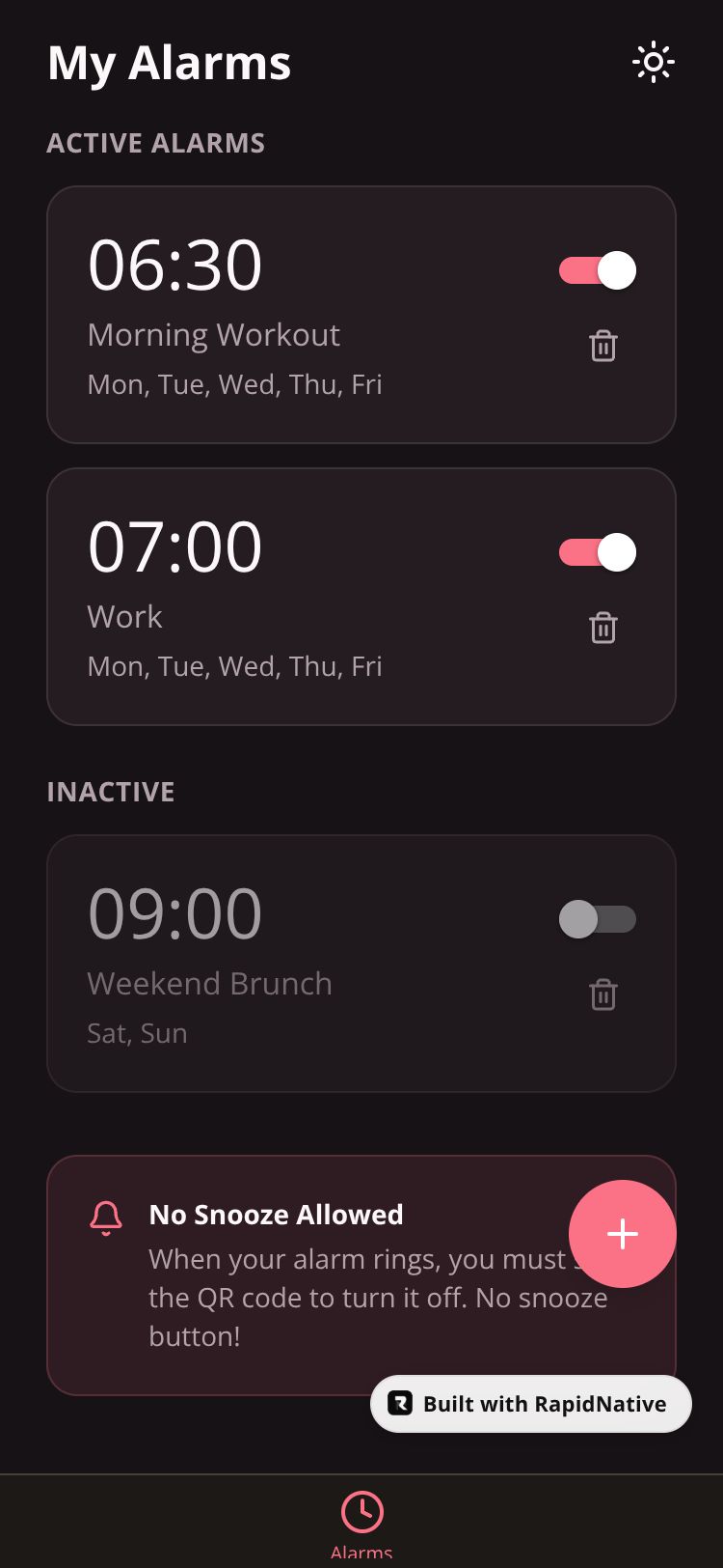 An alarm clock app that requires scanning a QR code to dismiss alarms - no snooze, just wake up and scan.