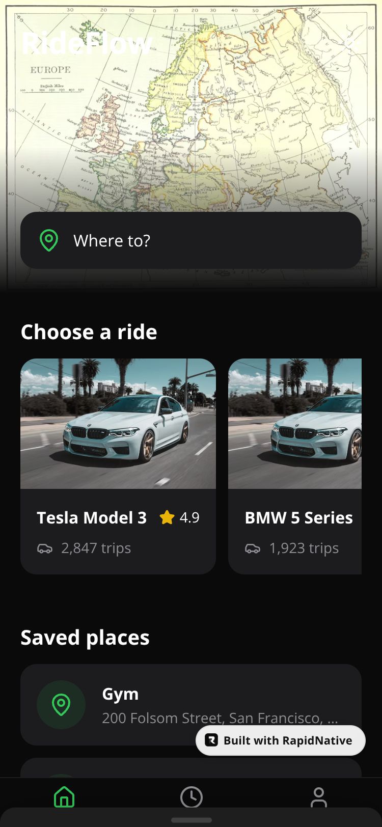 Browse this public project and clone it to start building your own React Native RideFlow app.