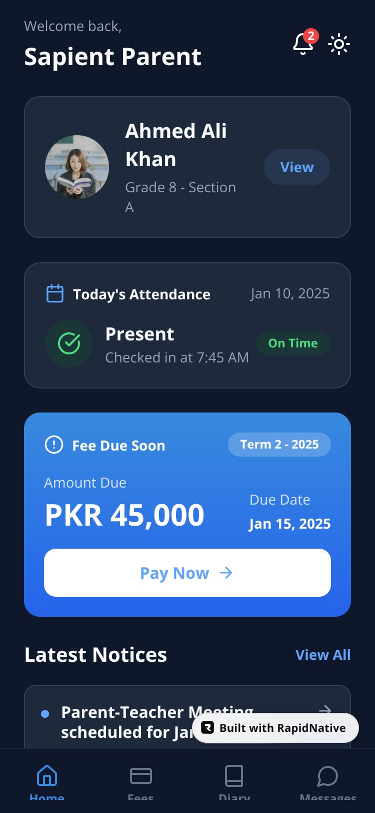 A comprehensive school management platform for parents to track attendance, fees, notices, and communicate with teachers.