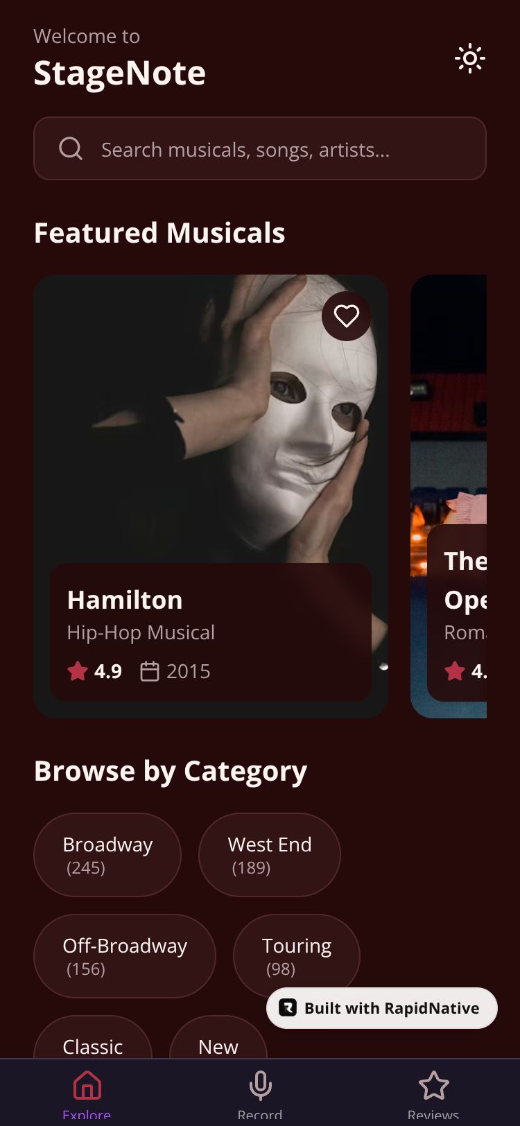 Record, review, and explore a comprehensive catalog of musicals. Capture your performances, share reviews, and discover Broadway shows.