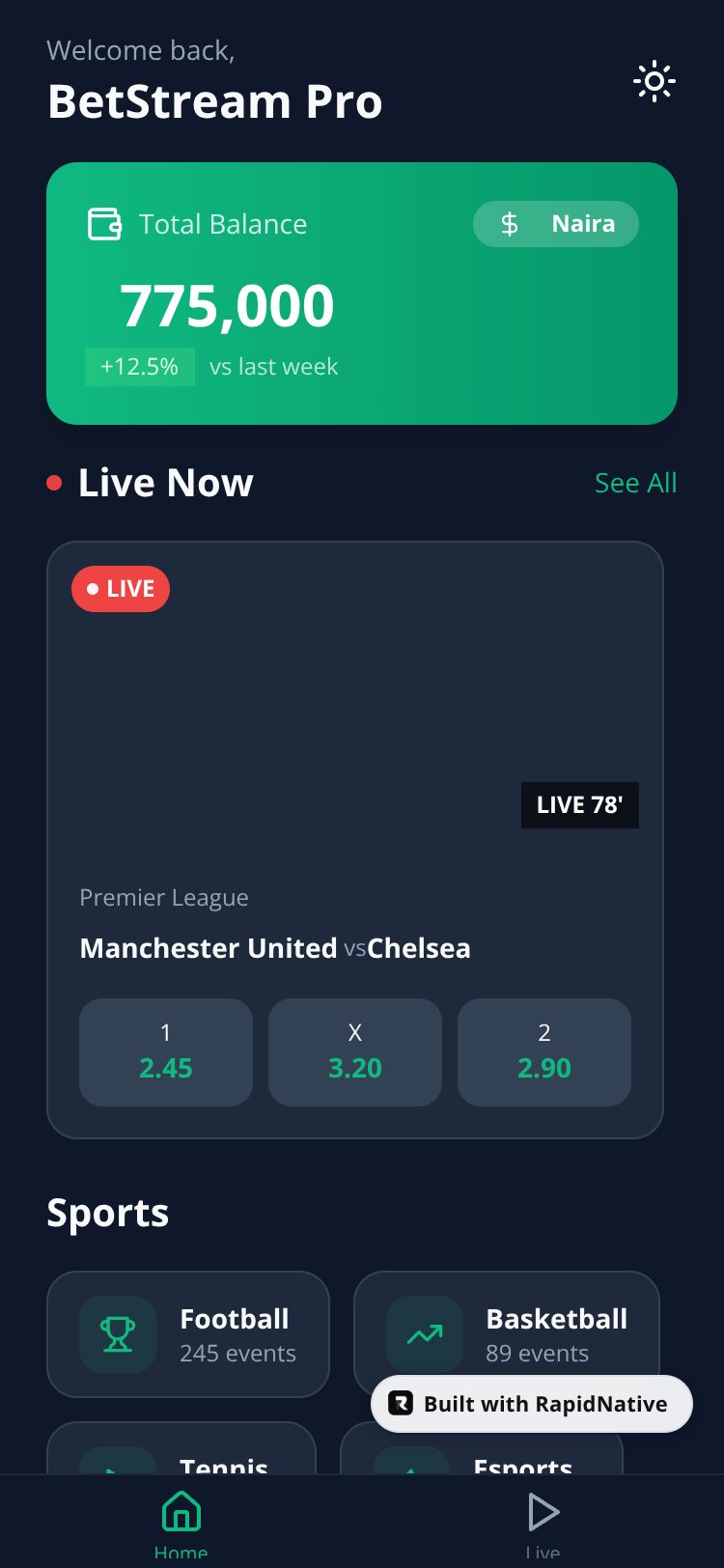 Browse this public project and clone it to start building your own React Native BetStream Pro app.