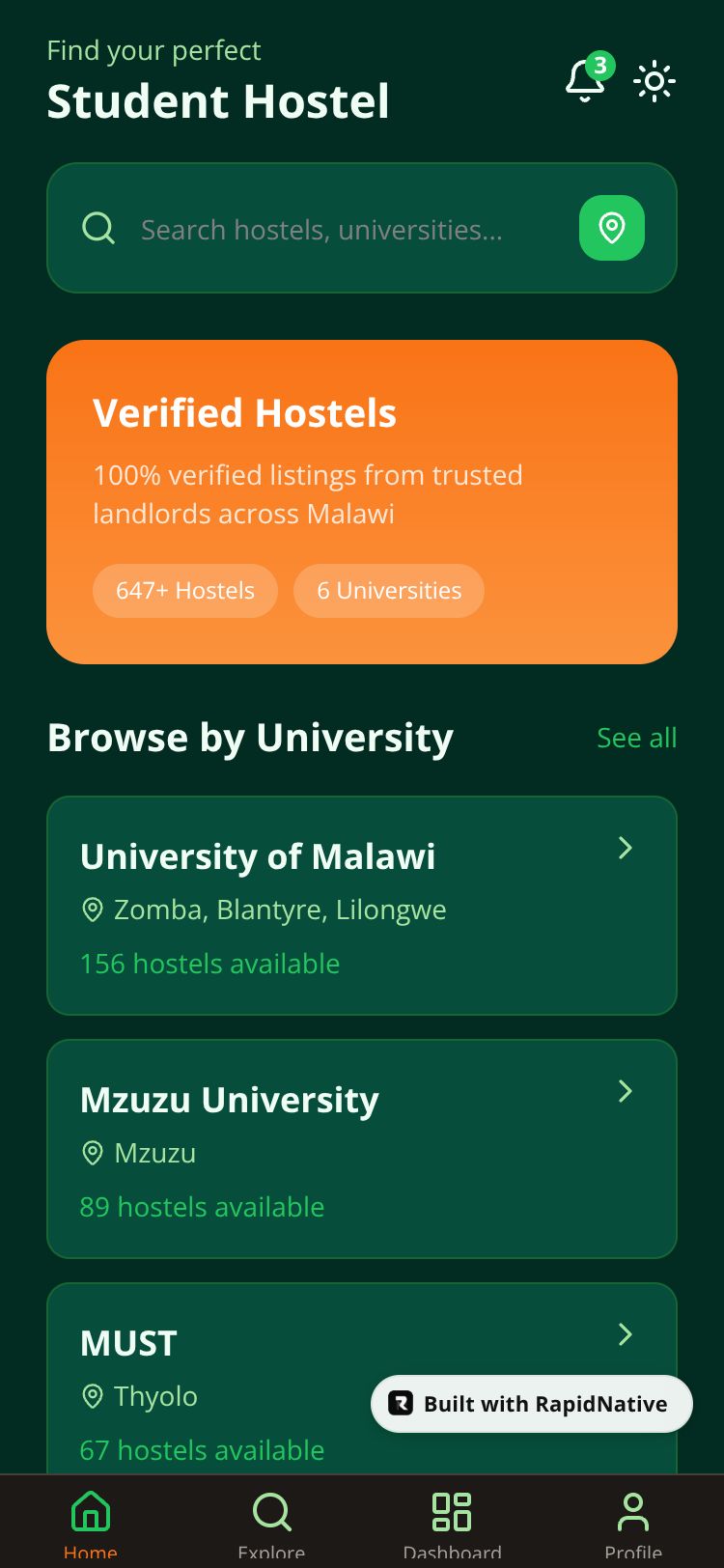 A centralized platform for university students in Malawi to find, compare, and book hostels near campus. Features smart search, verified listings, and direct landlord contact.