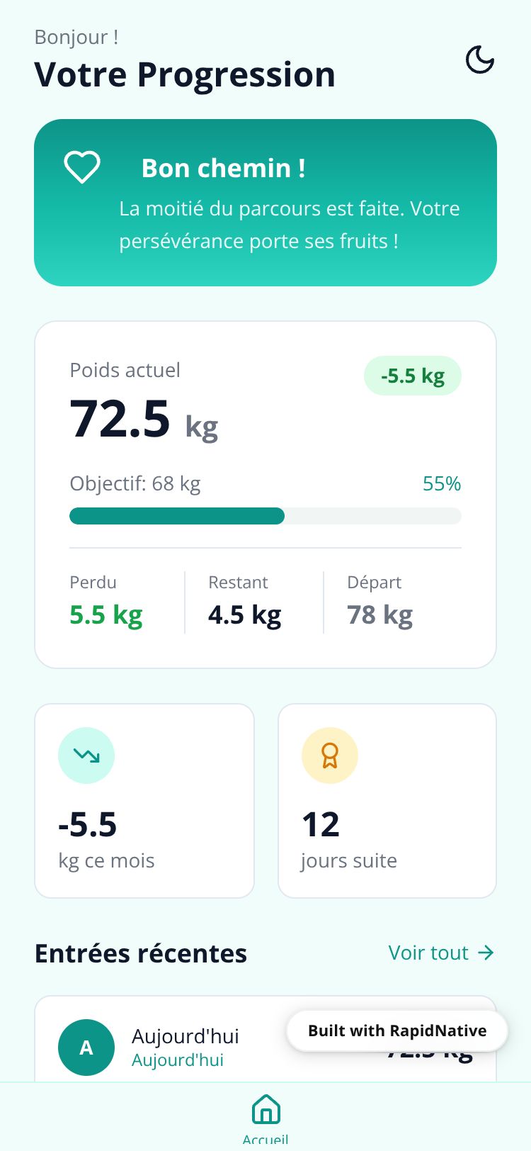 Application de suivi de poids personnalisée avec analyse, graphiques et encouragements pour atteindre vos objectifs de santé.