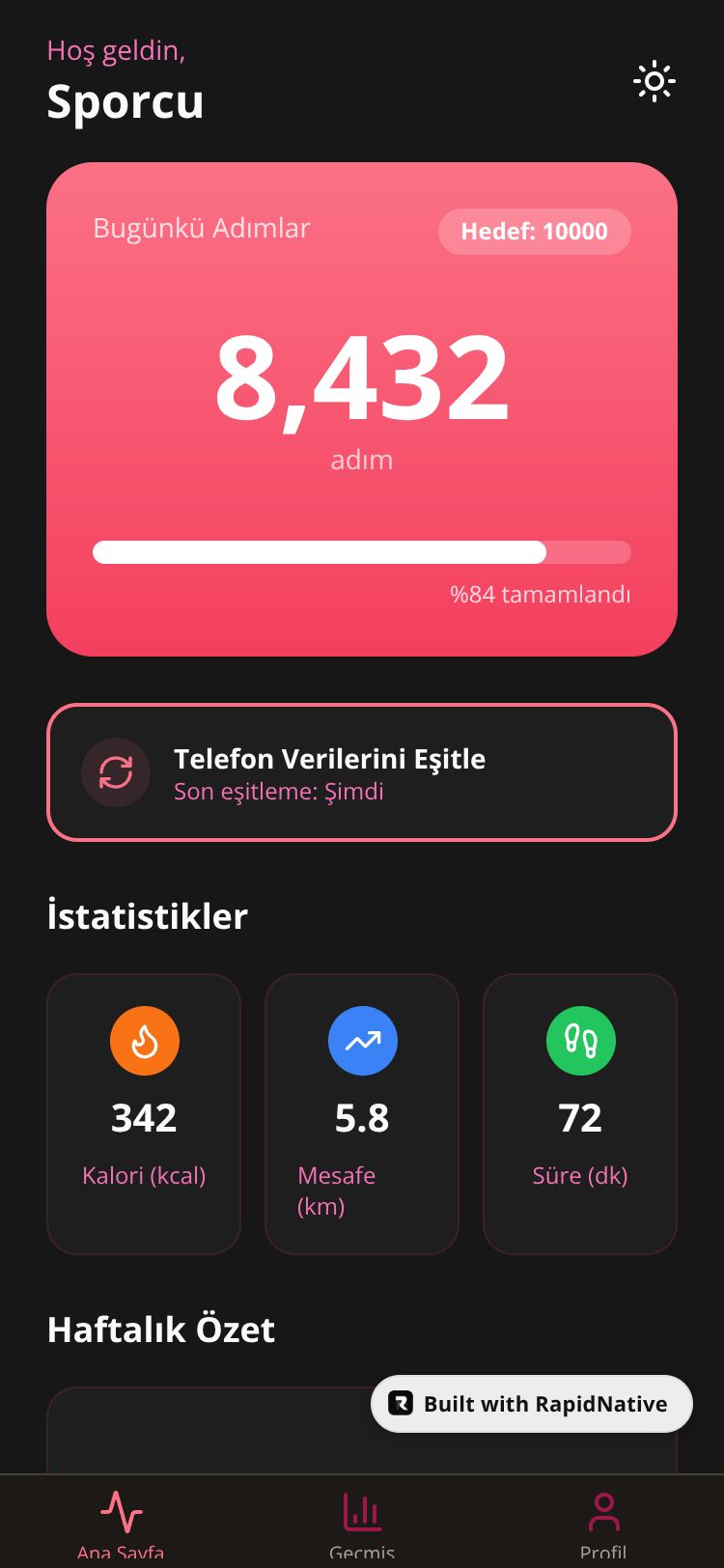 Sporcular için gelişmiş adım takibi uygulaması. Telefon adımsayarı ile veri senkronizasyonu ve günlük aktivite analizi.