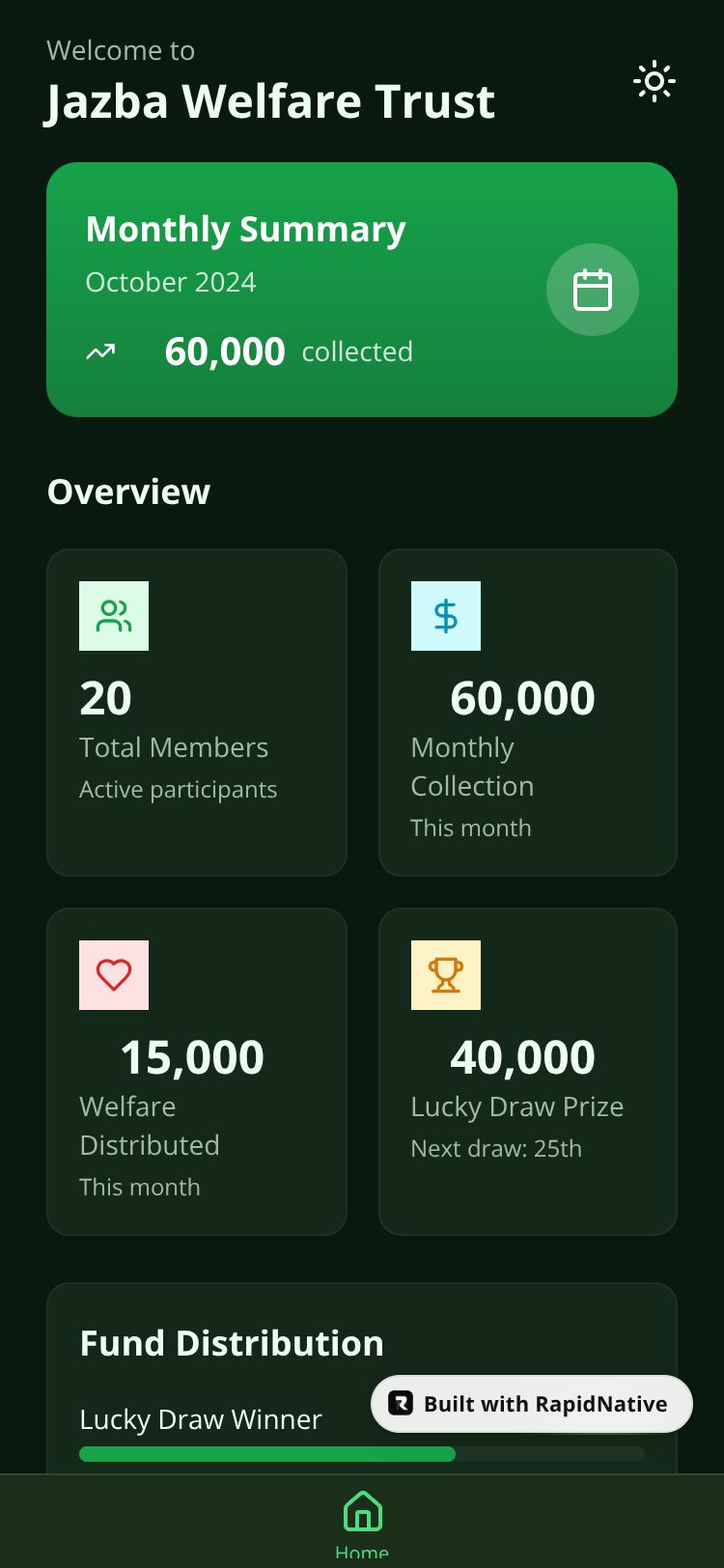 A comprehensive welfare trust management system for member contributions, lucky draws, and welfare activities tracking with full transparency.