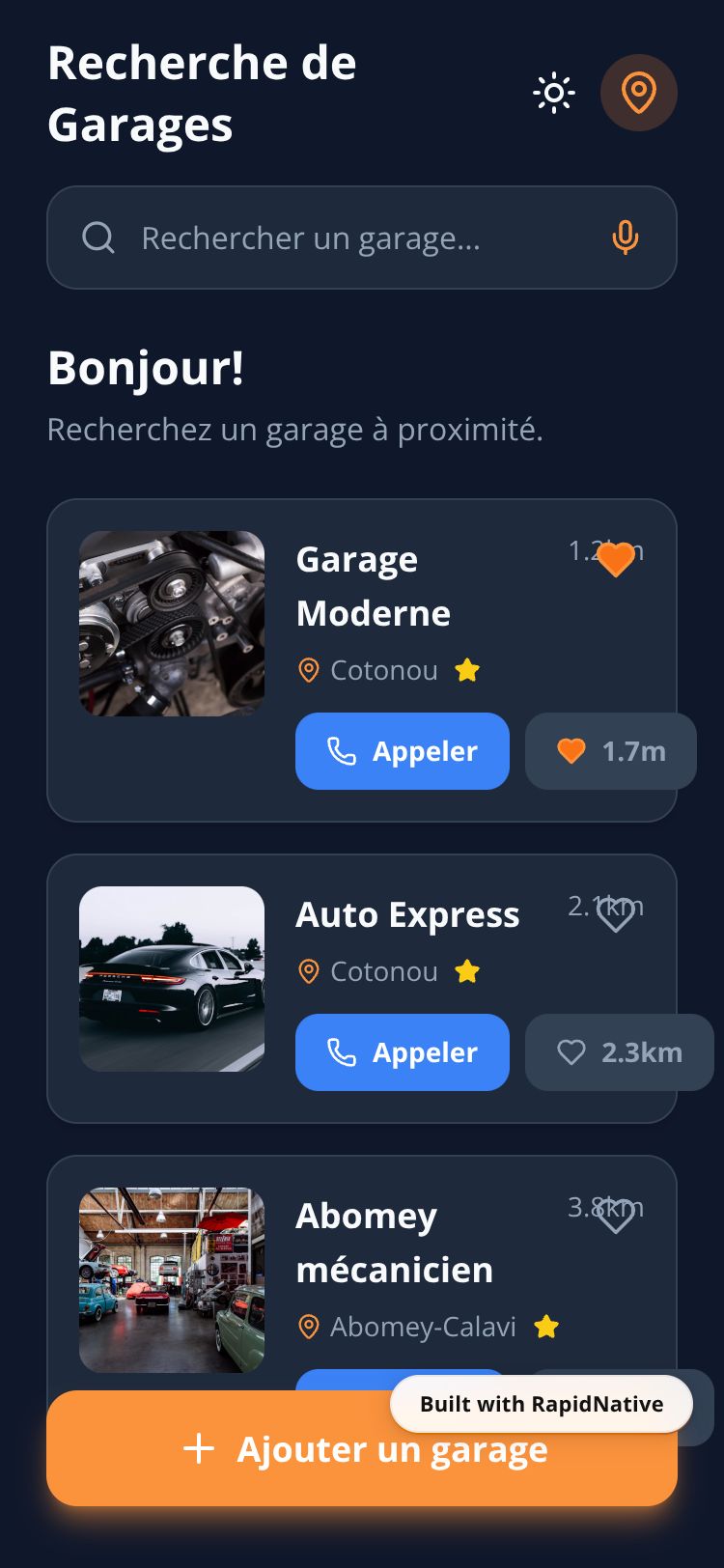 Browse this public project and clone it to start building your own React Native GarageFinder Bénin app.