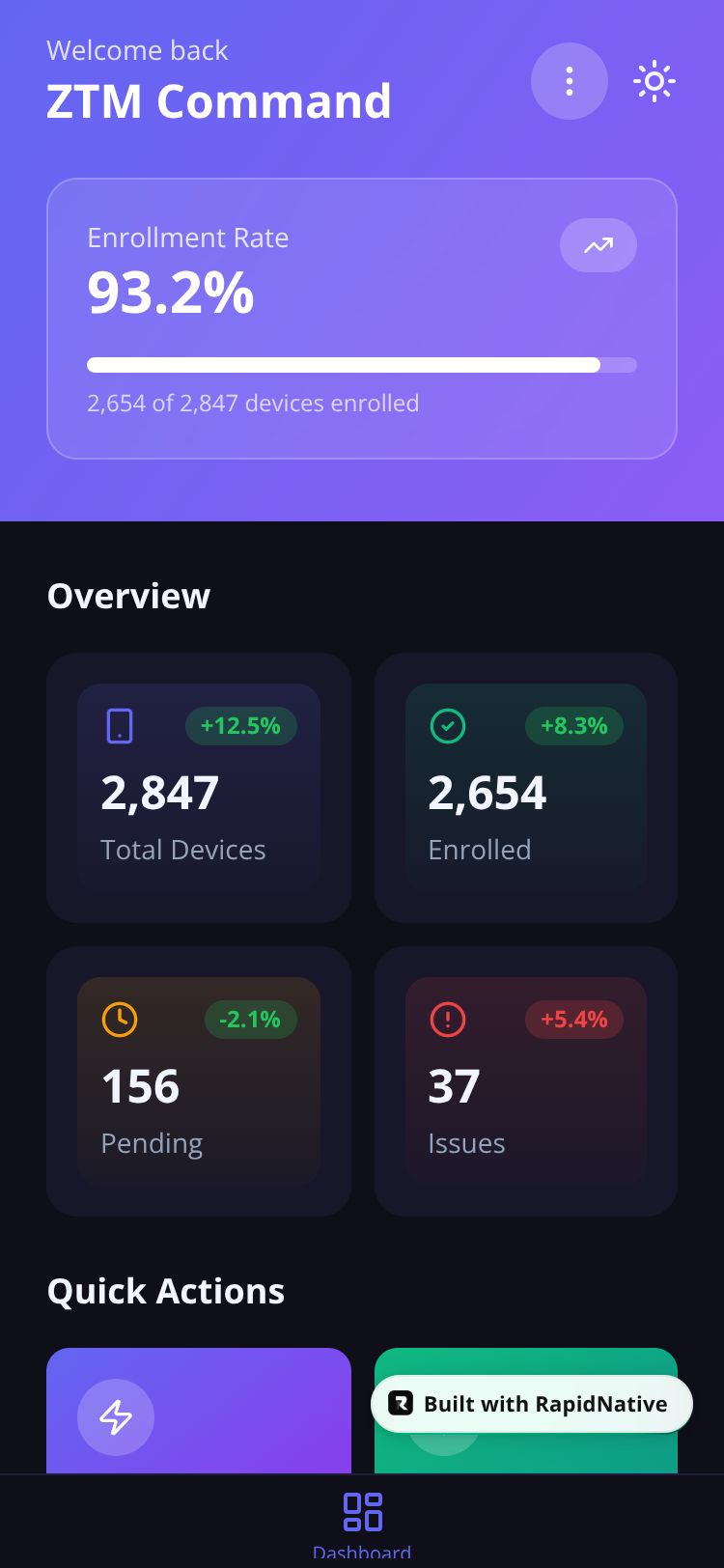 Enterprise zero-touch mobility enrollment management dashboard with real-time device tracking, MDM integration, and automated provisioning controls.