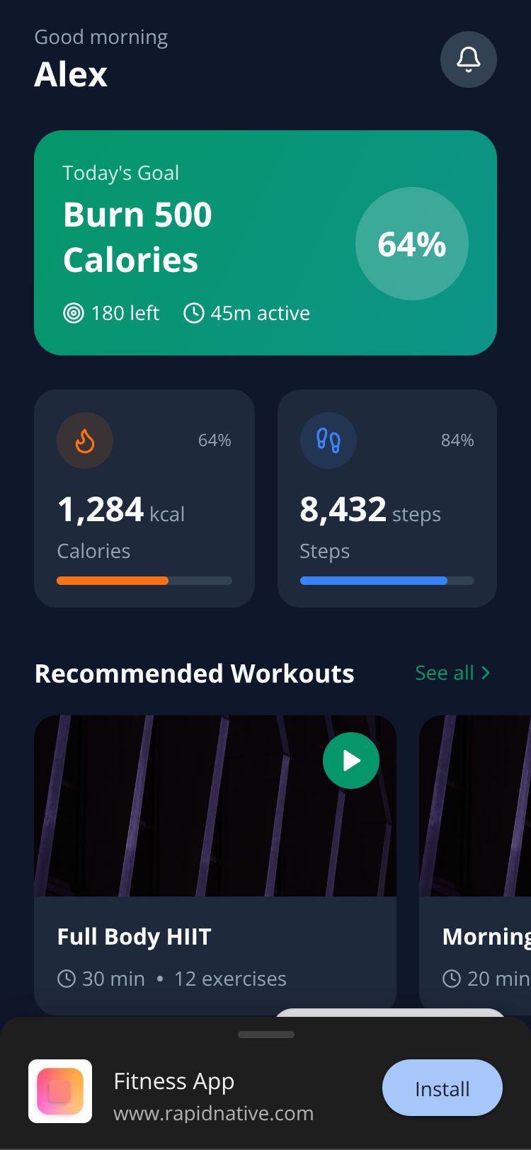 Browse this public project and clone it to start building your own React Native Fitness App app.