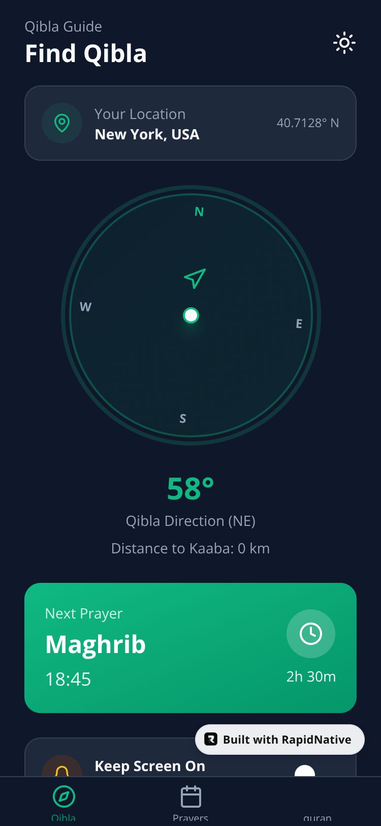 A comprehensive Islamic prayer companion app with Qibla direction finder, prayer times, and Quran audio recitation.