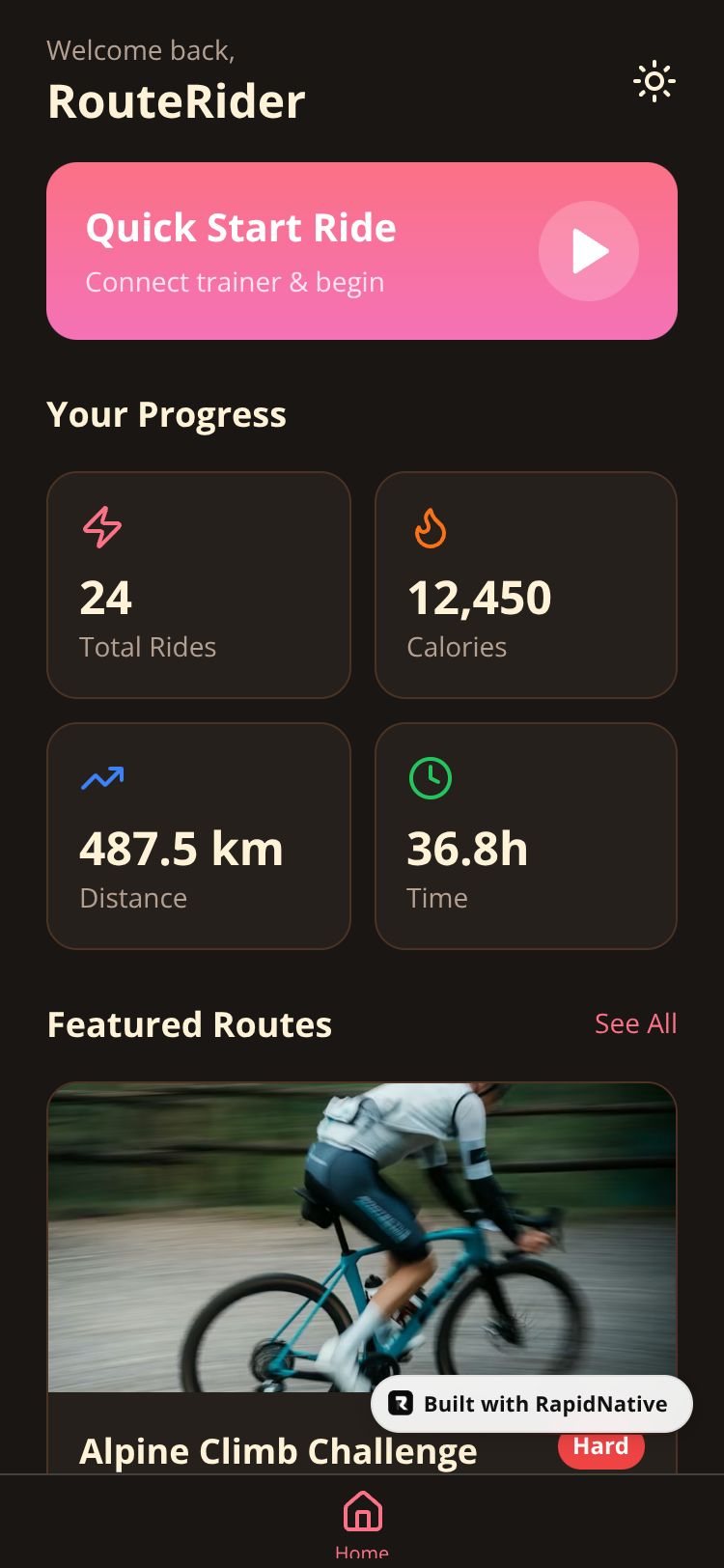 Indoor cycling training app with BLE trainer connectivity, real-world route visualization, incline profiles, and HealthKit integration for heart rate and calorie tracking.