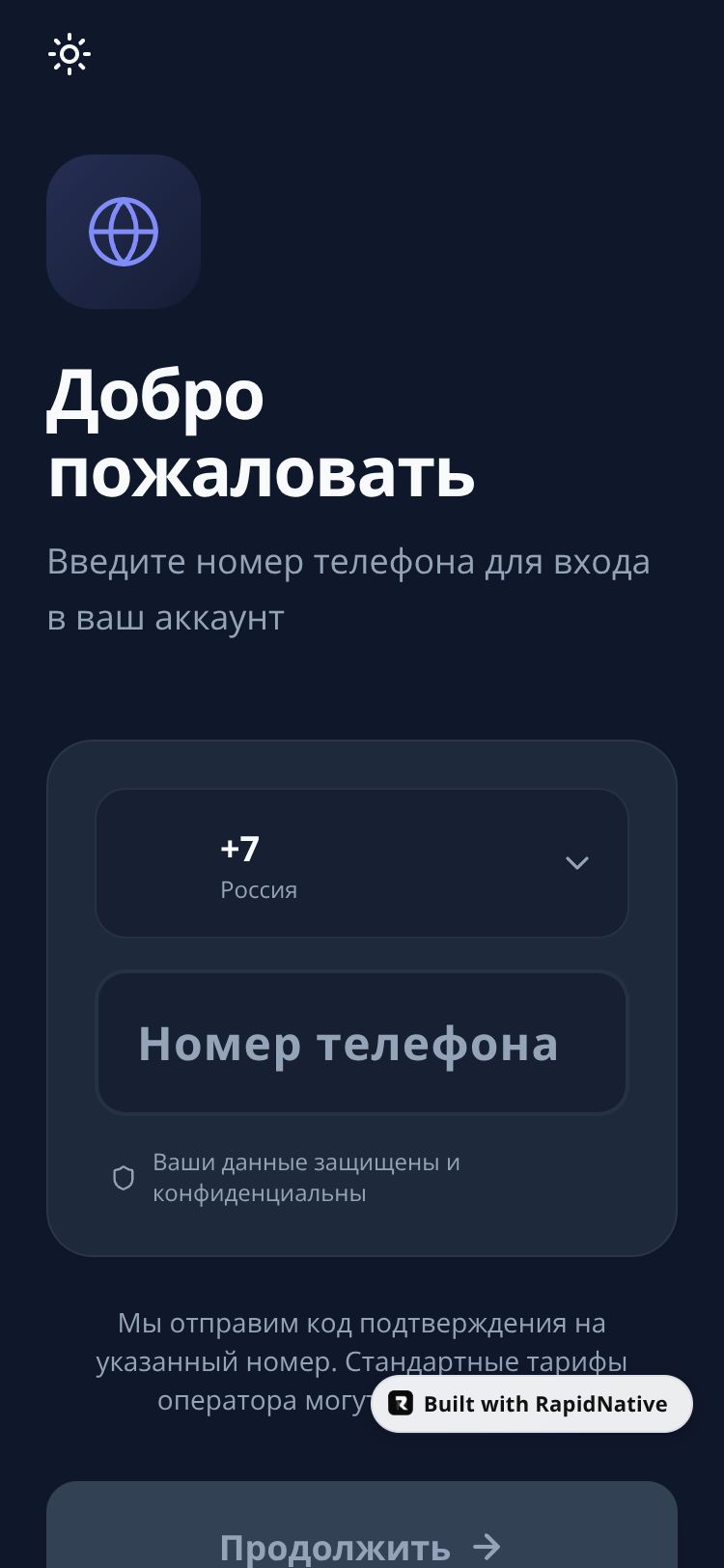 Modern messenger authentication flow with phone number input, country selection, and OTP verification.