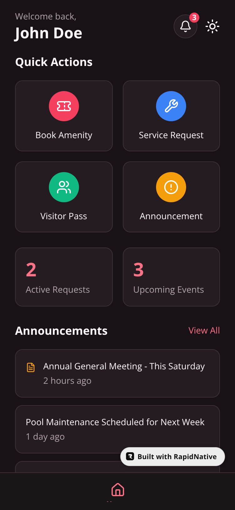 A complete community management platform for residential complexes. Features include event management, amenities booking, visitor passes, service requests, and role-based access for residents, admins, and security.
