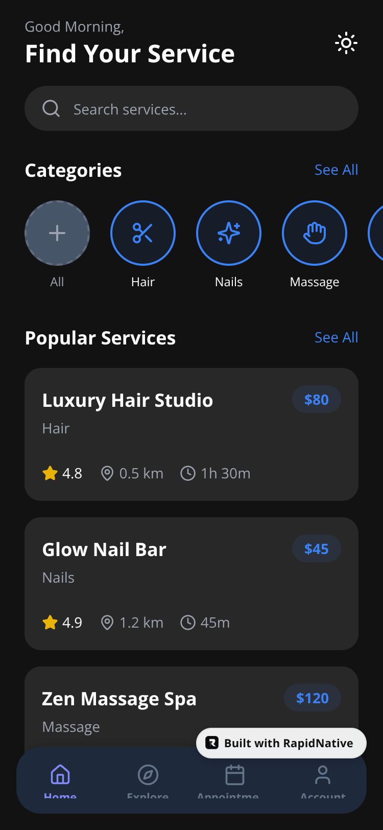 A modern service booking app for discovering and booking local services like massage, skincare, pet services, and health appointments.