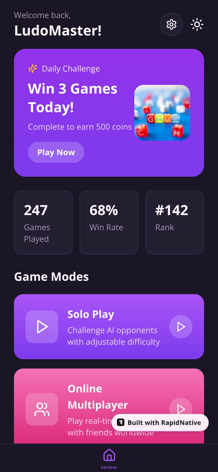 A multiplayer Ludo game app featuring solo play against AI, online multiplayer with friends, customizable boards, and comprehensive game statistics tracking.