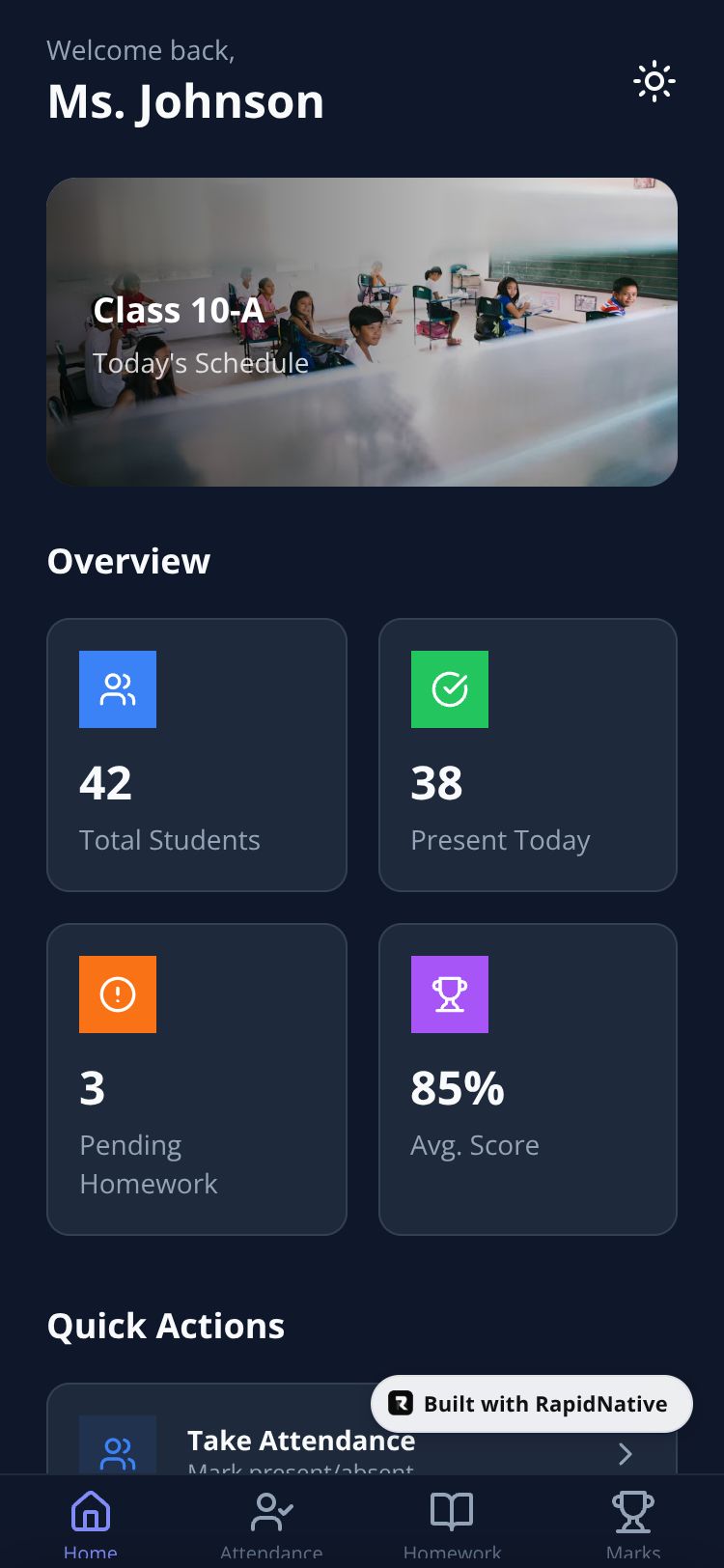A comprehensive classroom management app for teachers to track attendance, assign homework, write daily diaries, and manage student grades efficiently.