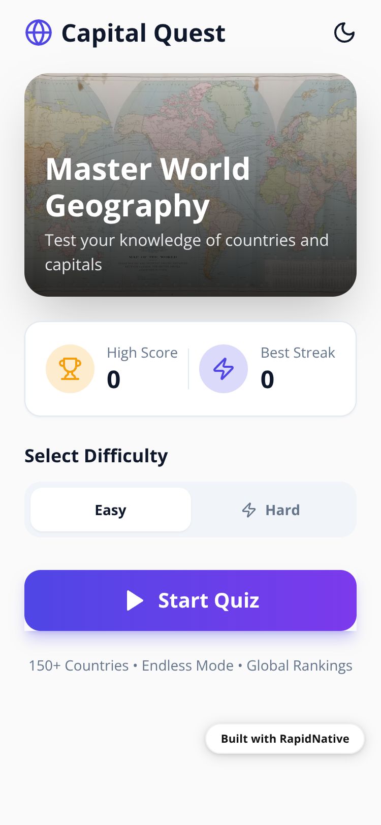 A premium country-capital quiz game featuring endless challenges, difficulty modes, and competitive scoring.