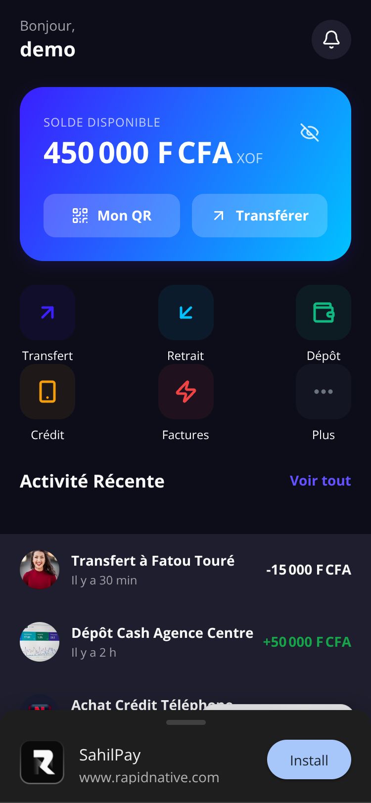Application mobile fintech de nouvelle génération pour la zone UEMOA. Transferts, paiements, et gestion d'argent en toute sécurité.