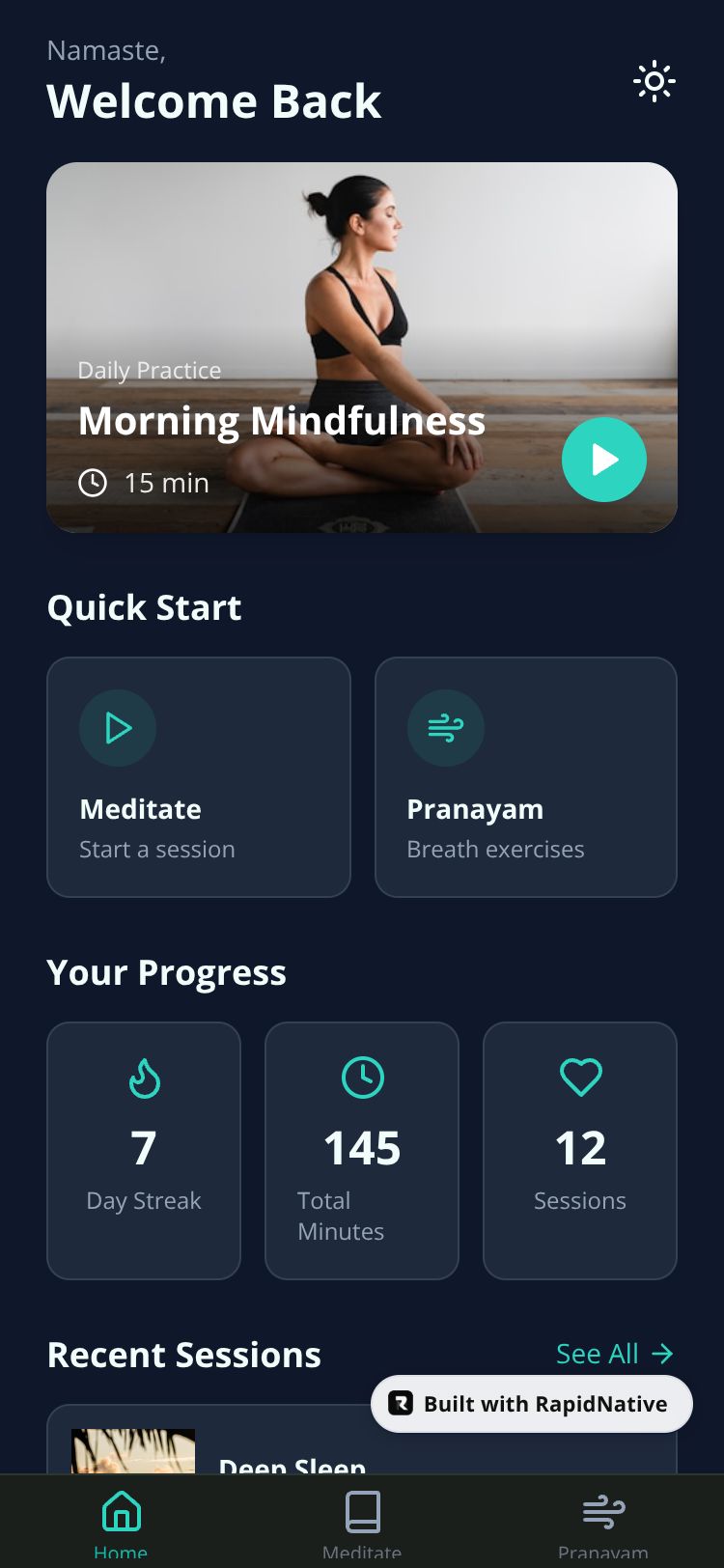 A mindfulness app combining guided meditation and pranayam breathwork for inner peace, stress relief, and spiritual wellness.