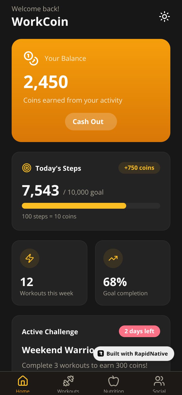 A fitness rewards app that tracks your steps and workouts, earning you coins that can be cashed out to PayPal or gift cards.
