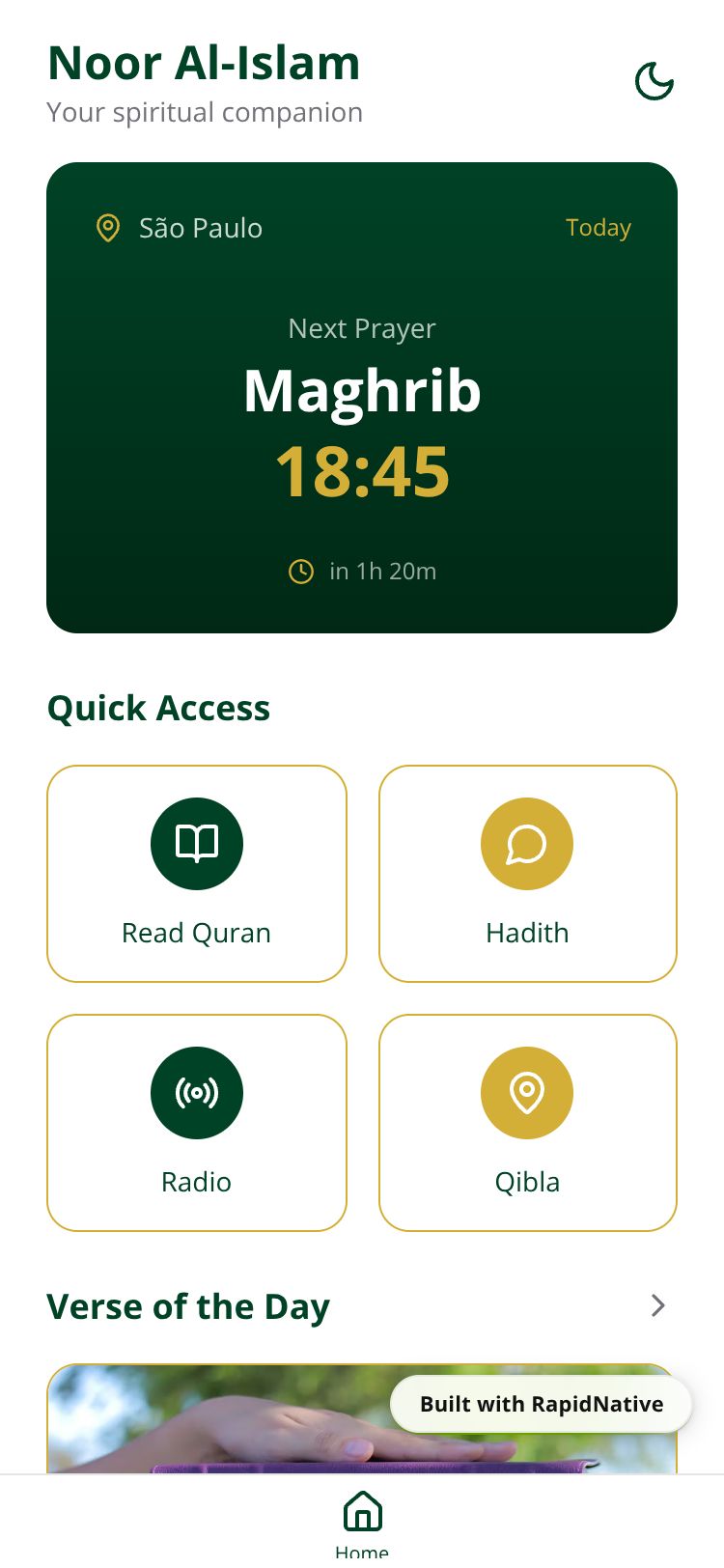 A comprehensive Islamic platform featuring Quran, Hadith, Prayer Times, and Radio, designed for a global audience with offline support.