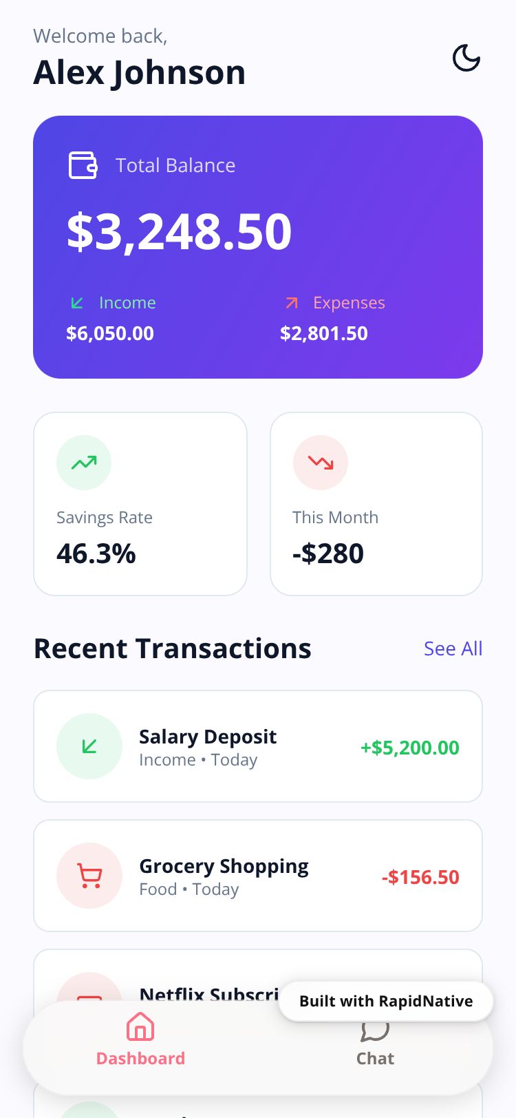 Browse this public project and clone it to start building your own React Native BudgetFlow app.