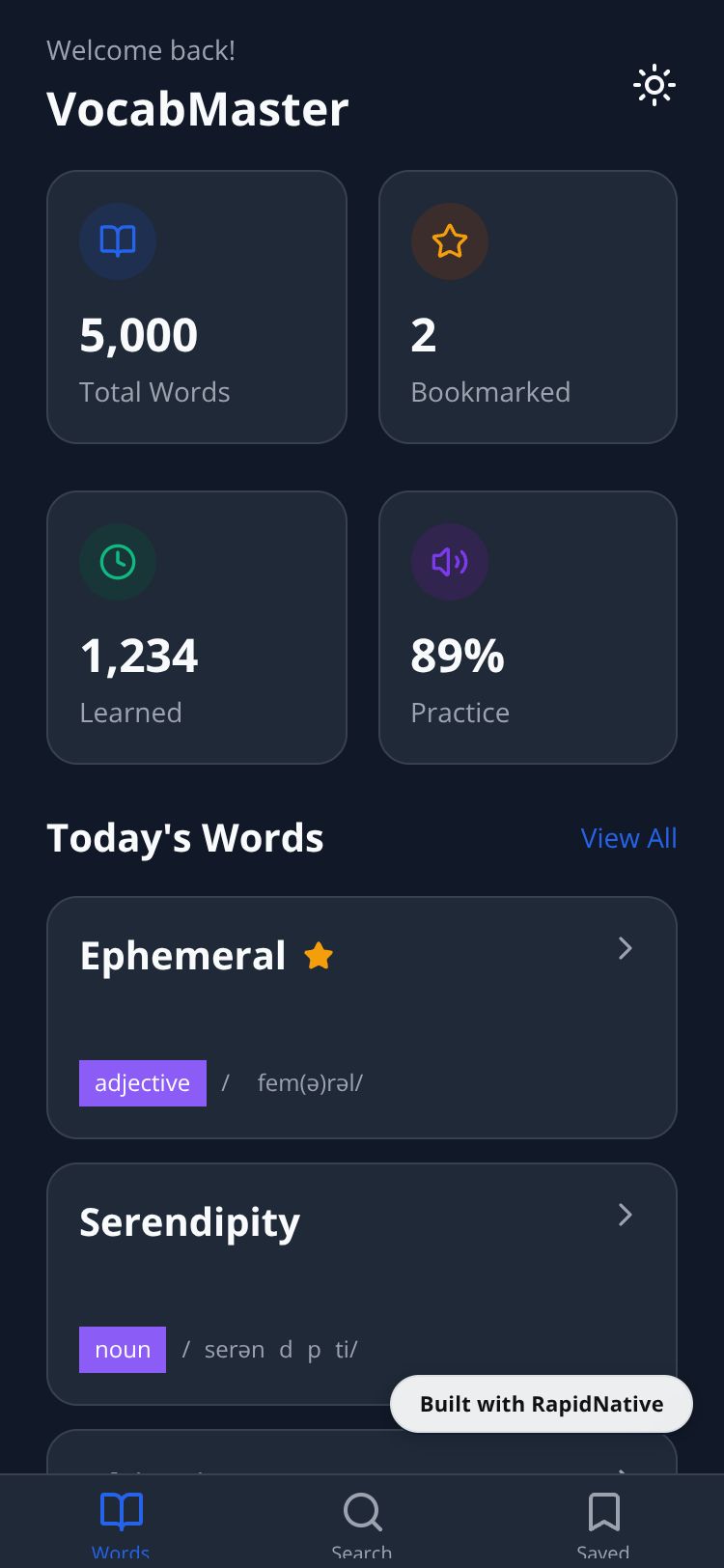 Browse this public project and clone it to start building your own React Native VocabMaster Pro app.
