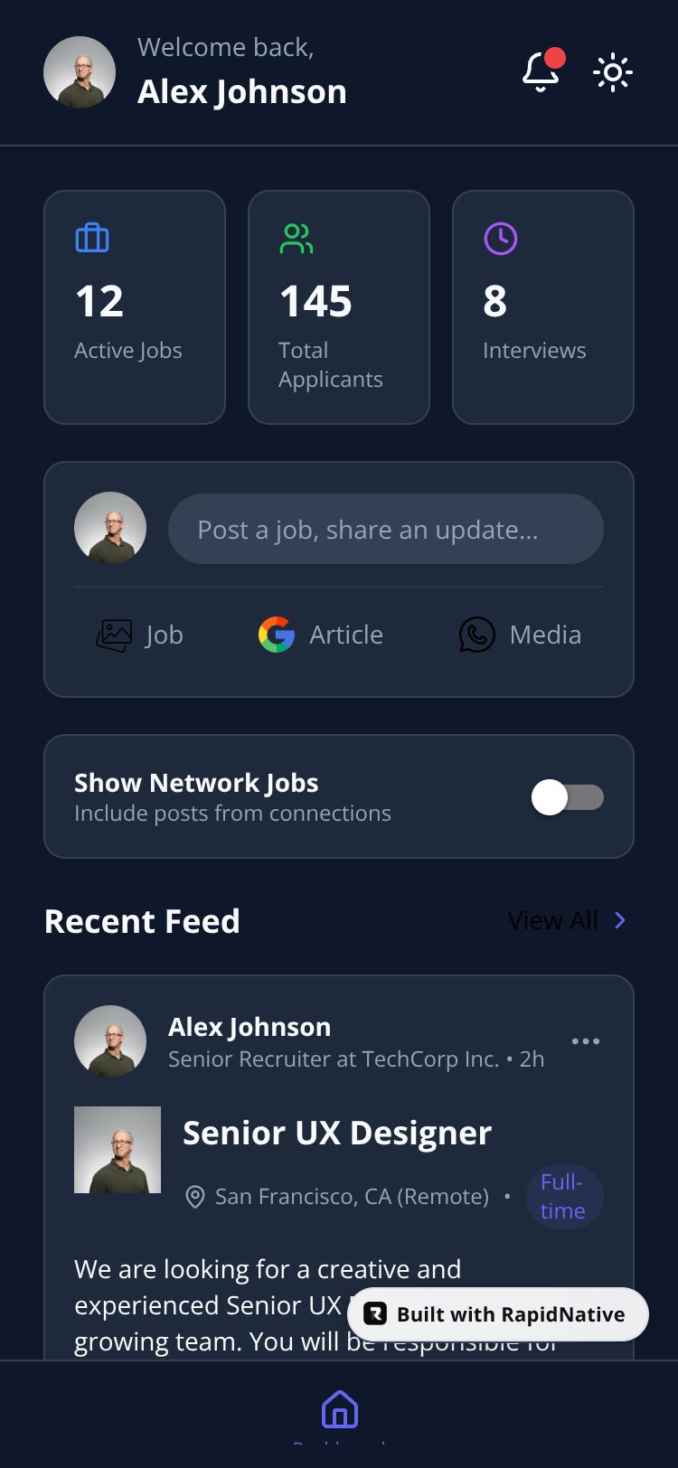 A modern job provider dashboard for recruiters to manage postings, track applicants, and analyze hiring metrics efficiently.