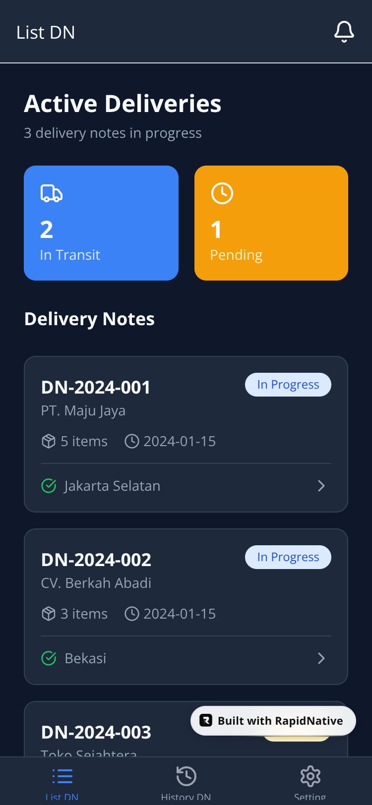 Electronic Delivery Note mobile app for tracking deliveries, managing history, and user settings with biometric authentication.