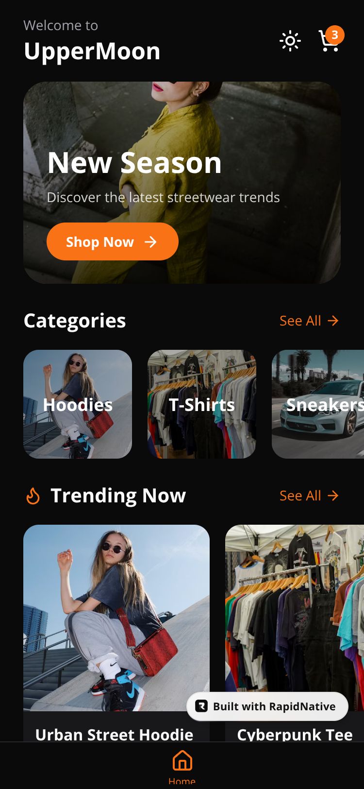 A premium streetwear e-commerce app featuring the latest urban fashion trends. Browse, shop, and track your favorite streetwear brands with a seamless mobile experience.