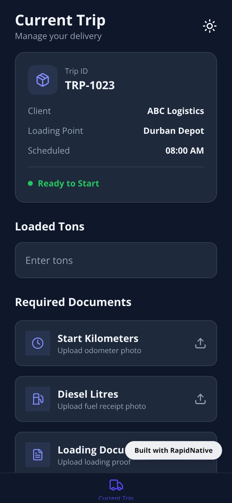 A professional logistics app for drivers to manage trips, track deliveries, and upload trip documentation.
