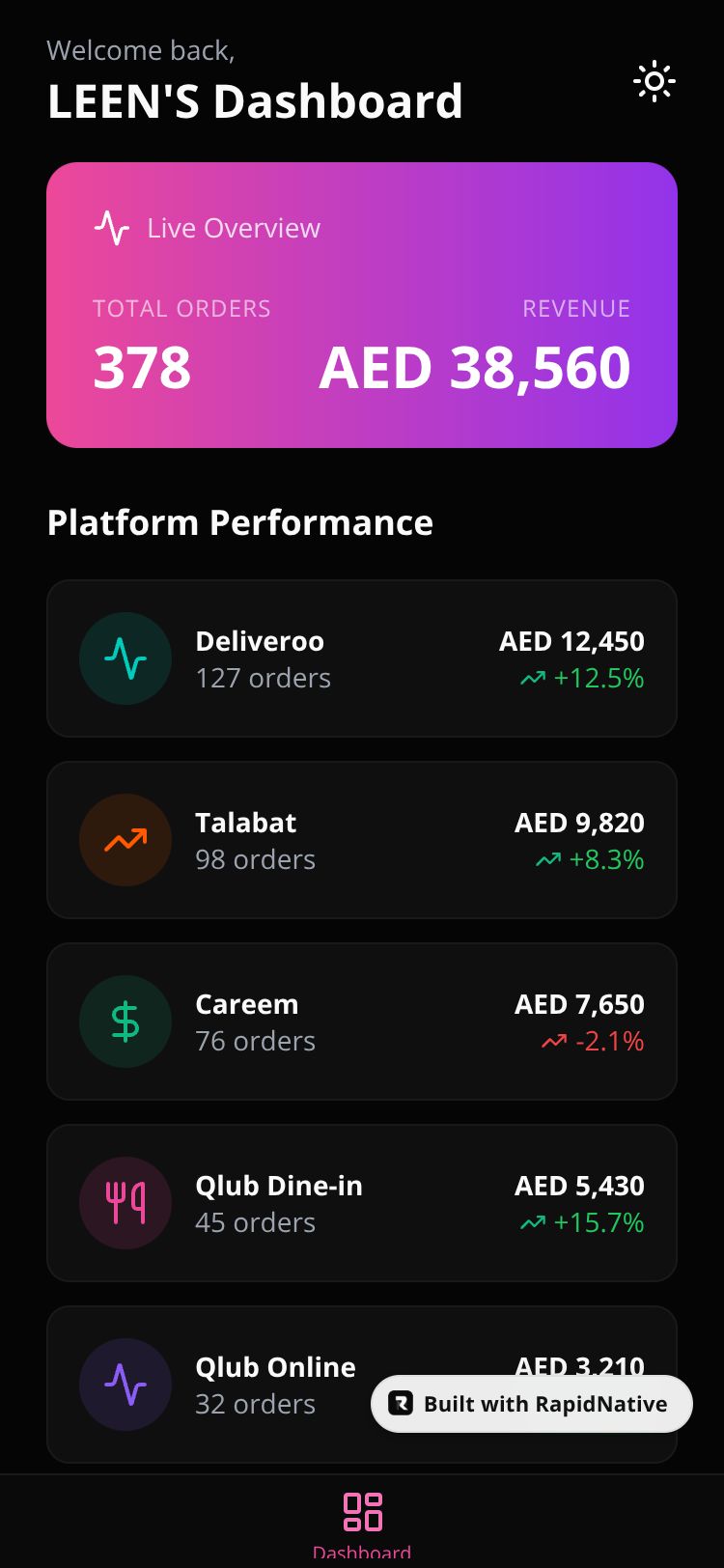A luxury restaurant management app for LEEN'S with menu checking, platform integration, reservations, and real-time dashboard.