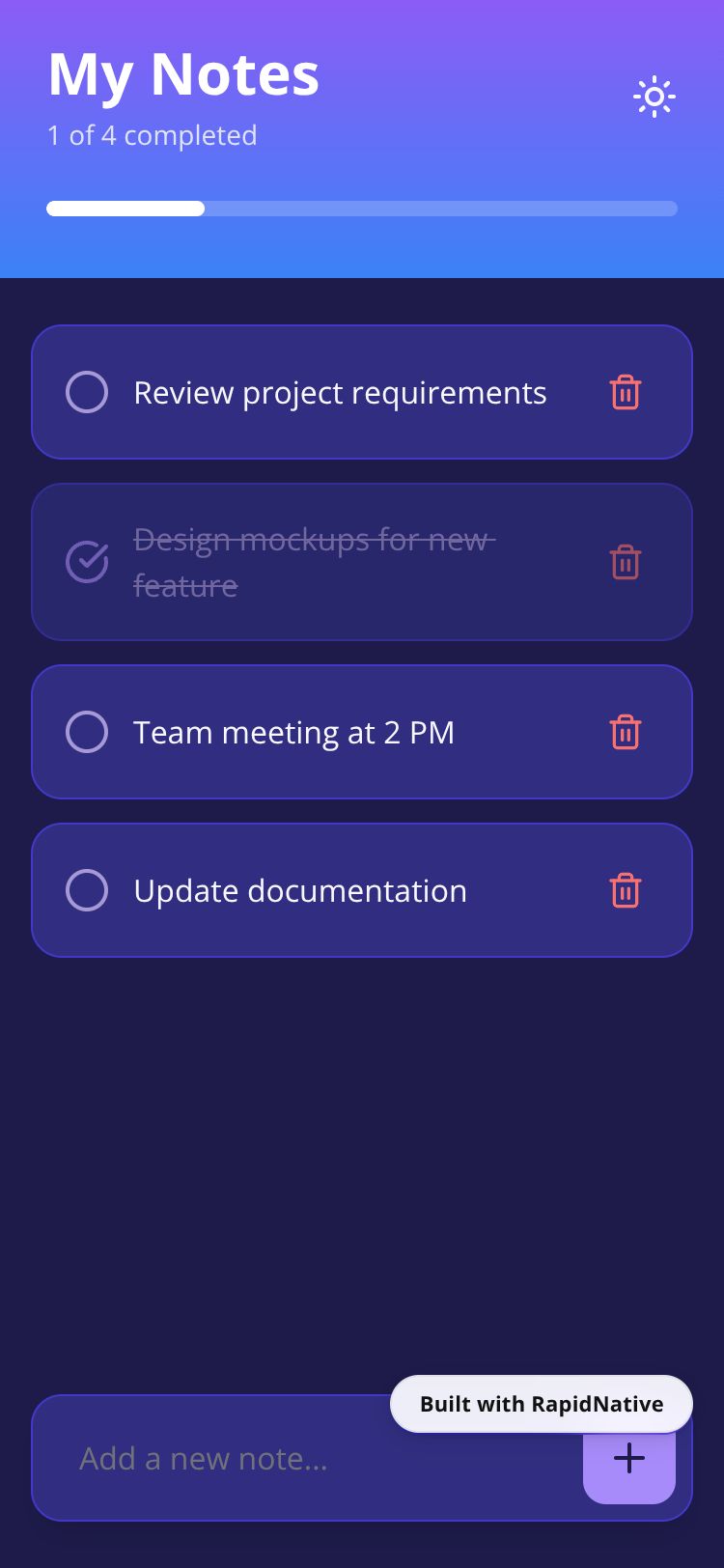Browse this public project and clone it to start building your own React Native PurpleCheck Notes app.