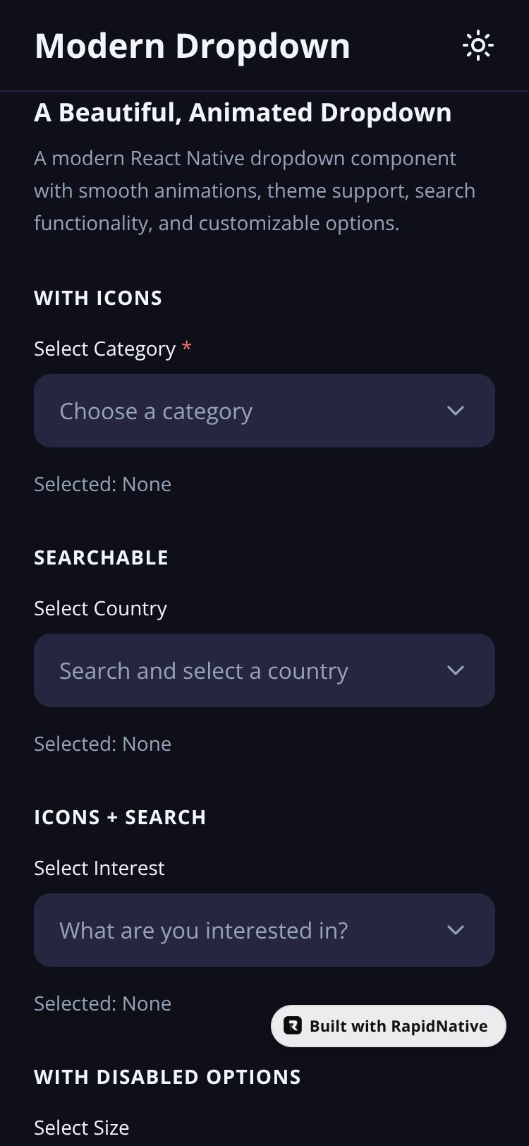 A modern, animated React Native dropdown component with theme support, search functionality, and clean design.