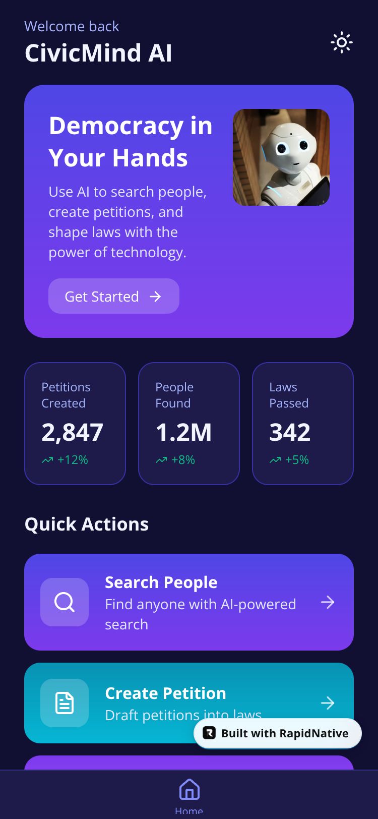 An AI-powered civic engagement platform enabling people search, petition creation into laws, and comprehensive AI assistance for democratic participation.