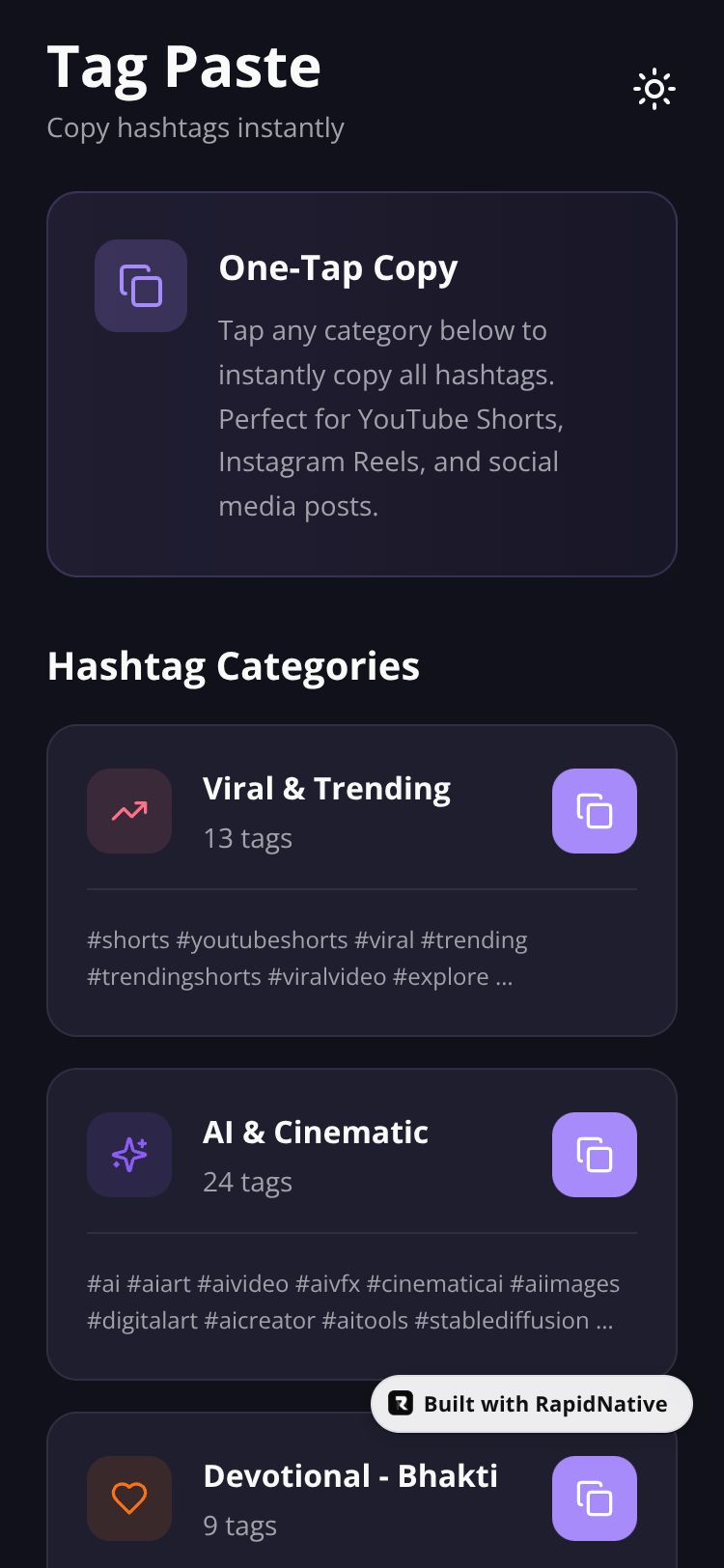 Browse this public project and clone it to start building your own React Native Tag Paste App app.