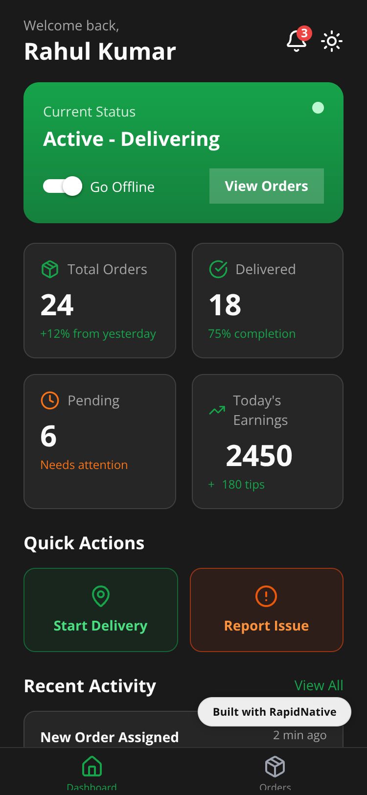 A professional delivery rider app with real-time order management, attendance tracking, and COD remittance features.