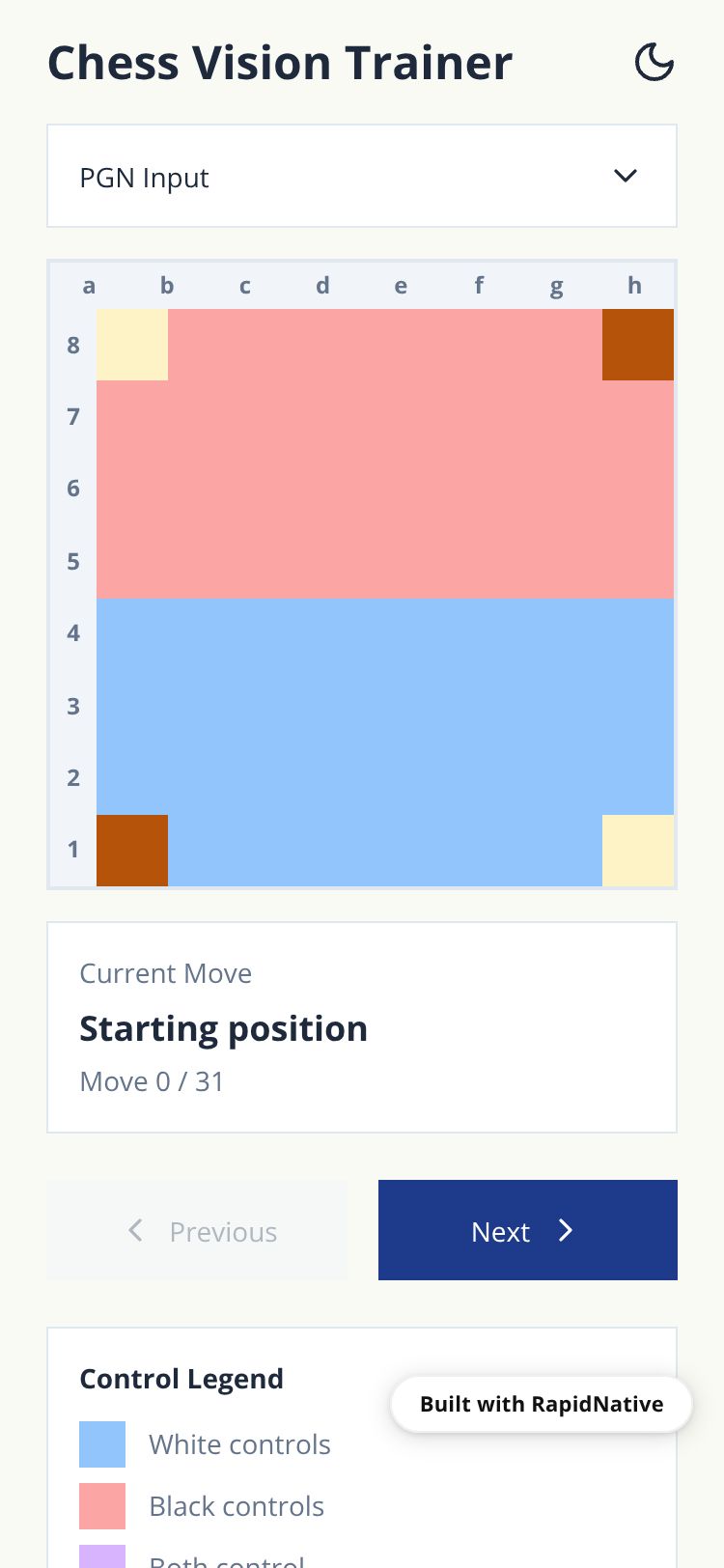 A chess visualization tool to help understand piece control and positions. Load PGN games, navigate moves, and see piece control highlighted.