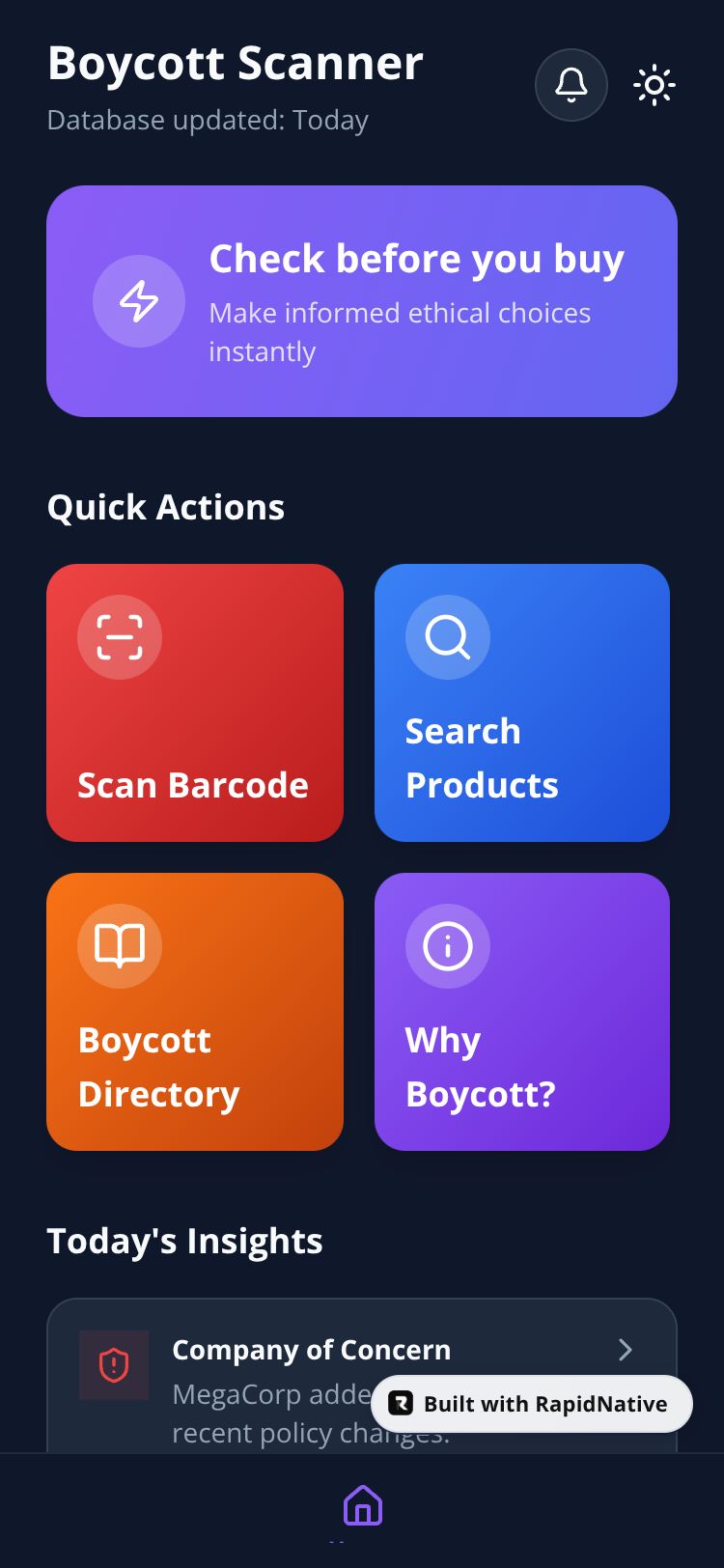 A powerful ethical shopping tool to scan barcodes and search products against boycott lists. Features offline directory access, real-time lookup, and detailed product analysis.