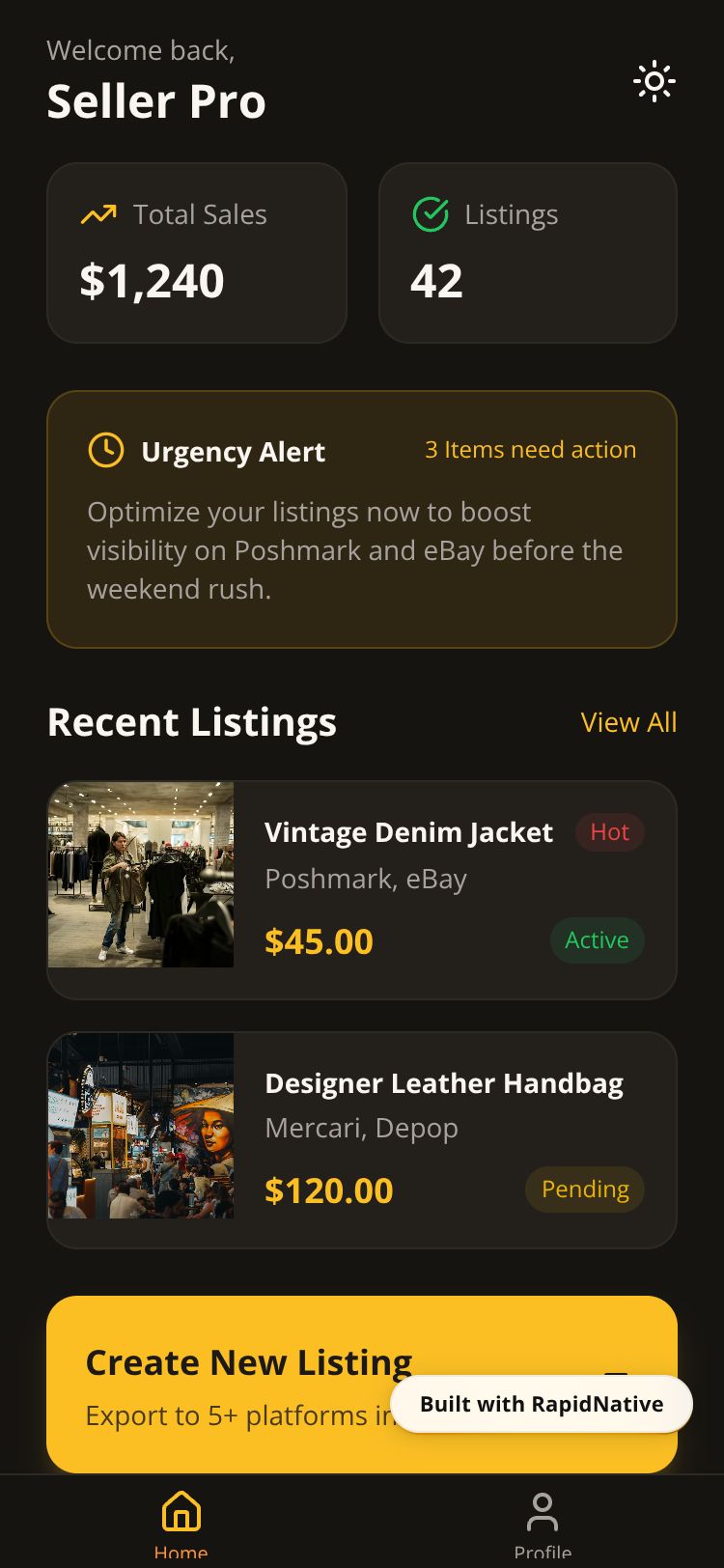 The ultimate cross-listing app for resellers. Create one attractive listing and export instantly to eBay, Poshmark, Mercari, Depop, and more.