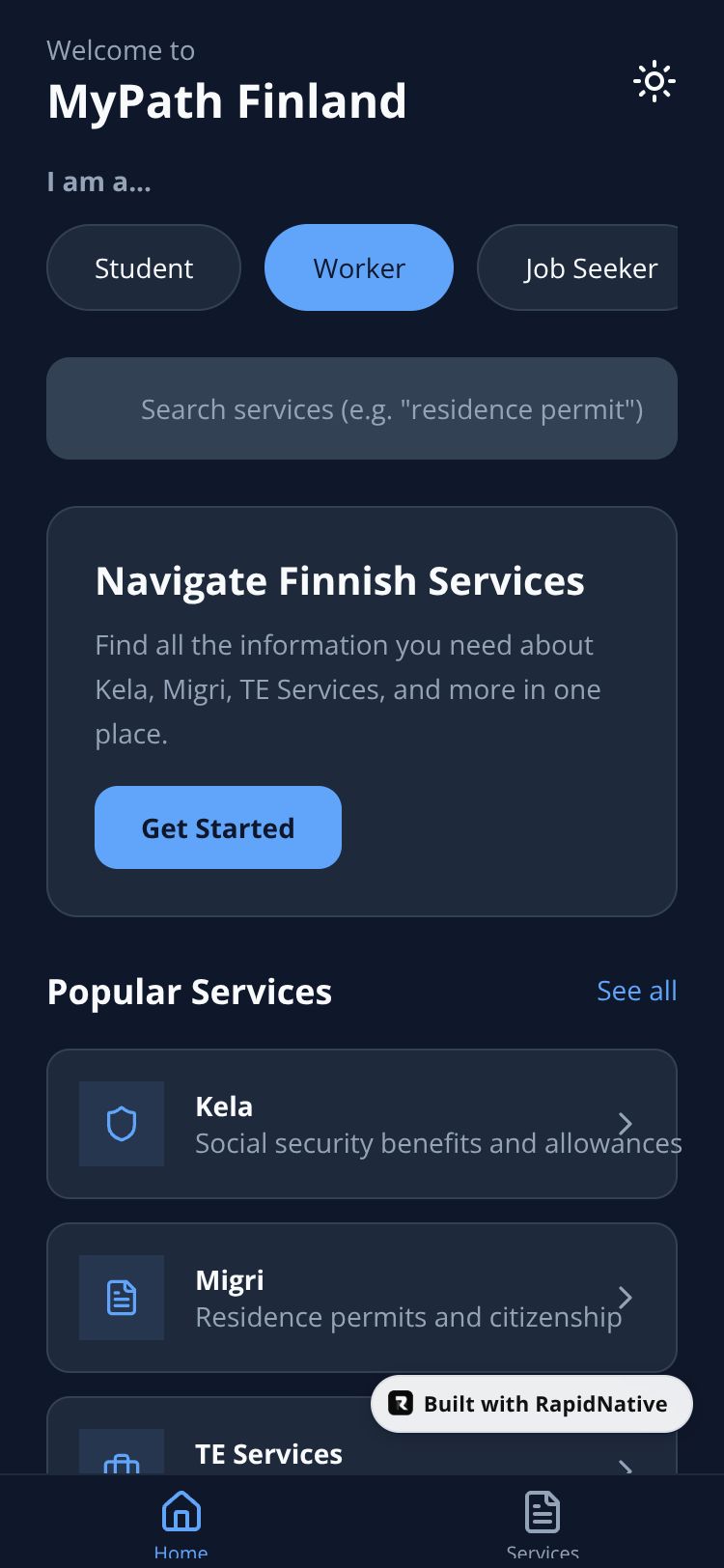 A centralized mobile app helping immigrants in Finland navigate public services like Kela, Migri, and TE Services with ease.