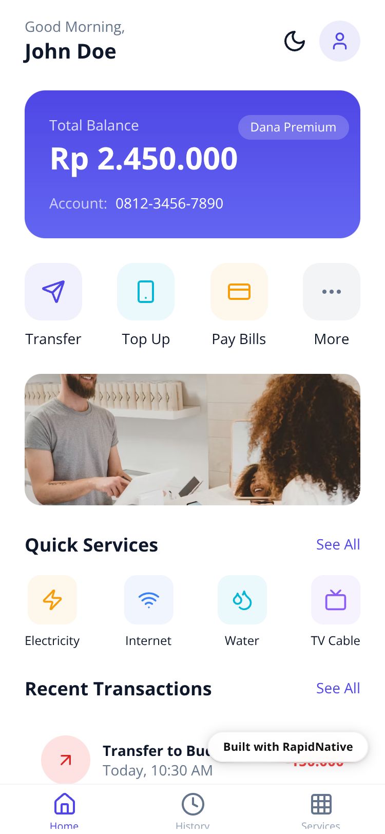 A professional e-wallet and PPob payment app with elegant design. Send money, pay bills, top up, and manage transactions securely.