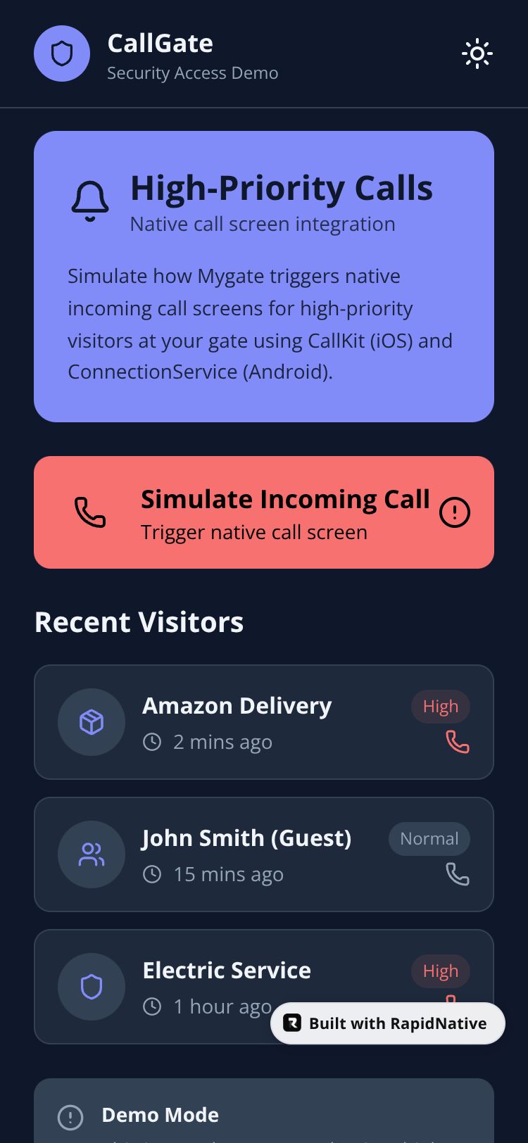 A demo app simulating high-priority call notifications for security gate access, mimicking Mygate behavior.