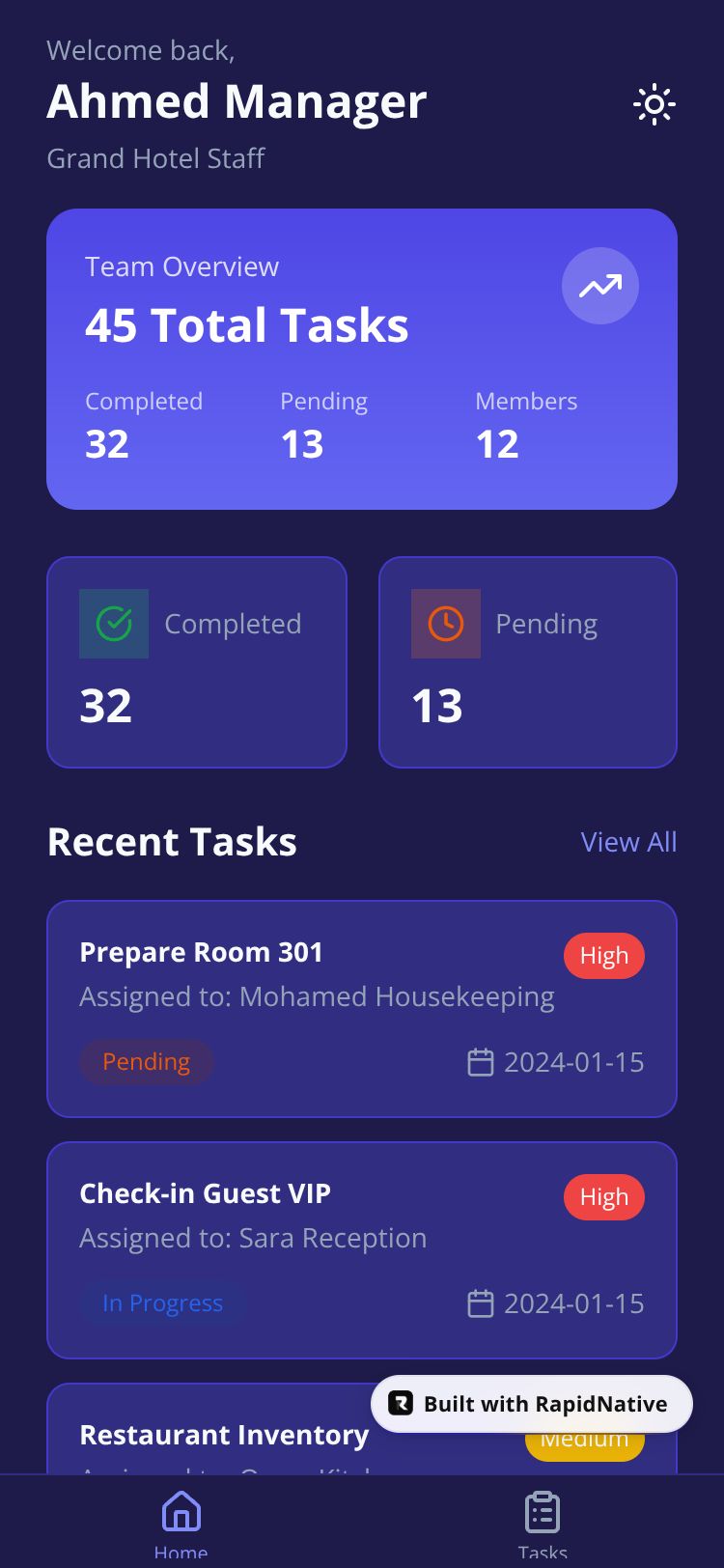 A comprehensive team and task management app for hotels and organizations. Create teams, assign tasks, track progress, and manage employees efficiently with role-based access control.