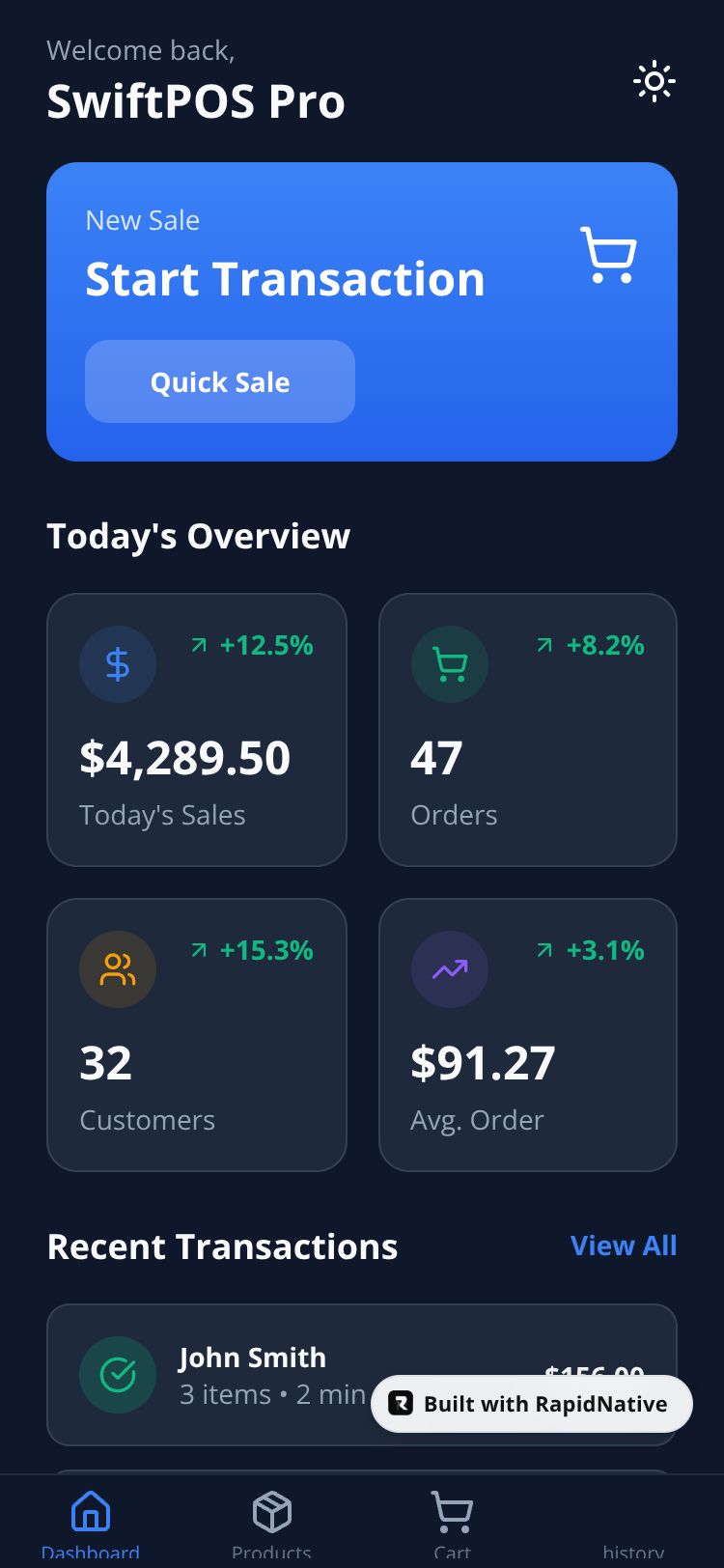 A modern mobile Point of Sale system for retail businesses with product management and transaction tracking.