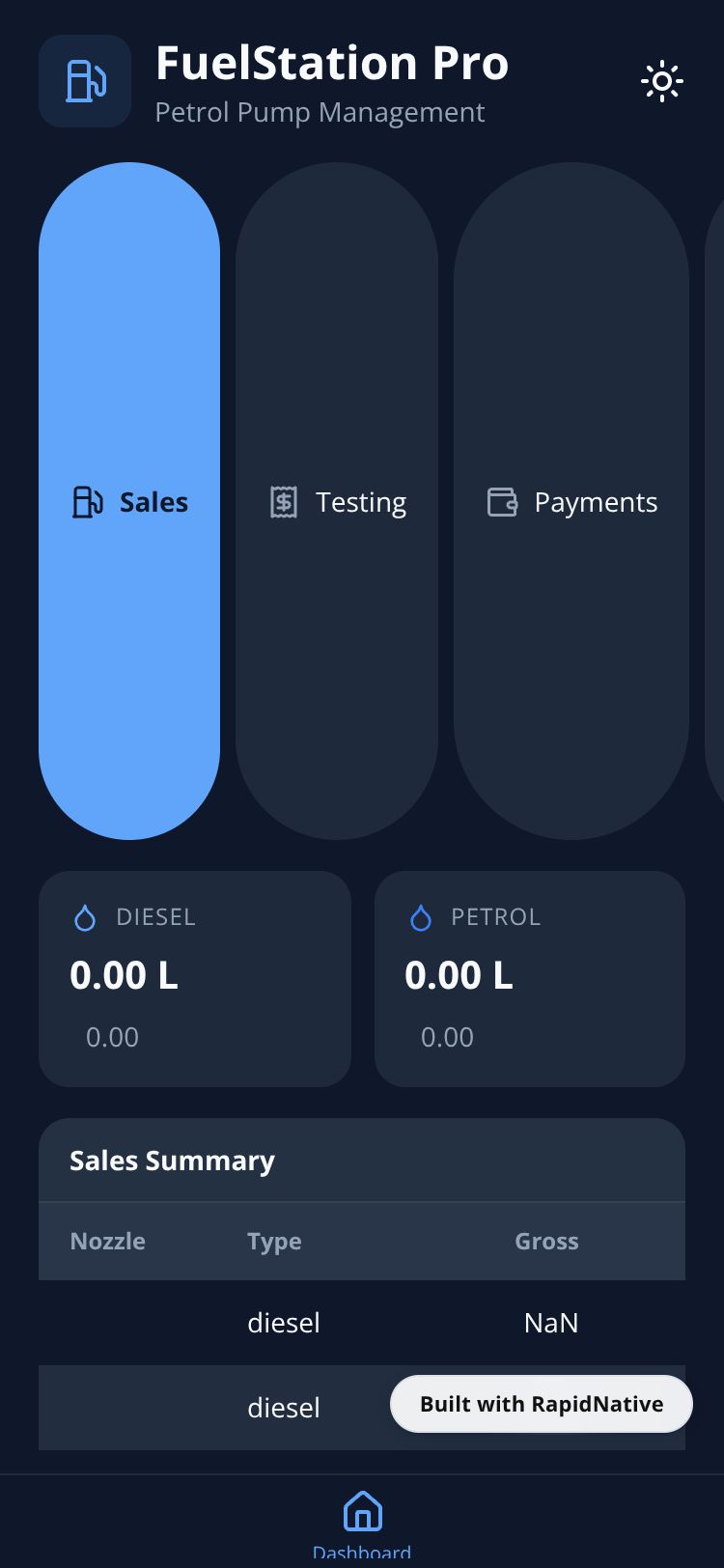 A comprehensive petrol pump management dashboard with sales tracking, nozzle readings, testing records, cash/PhonePe payments, credit tracking, and expenditure monitoring for fuel station managers.