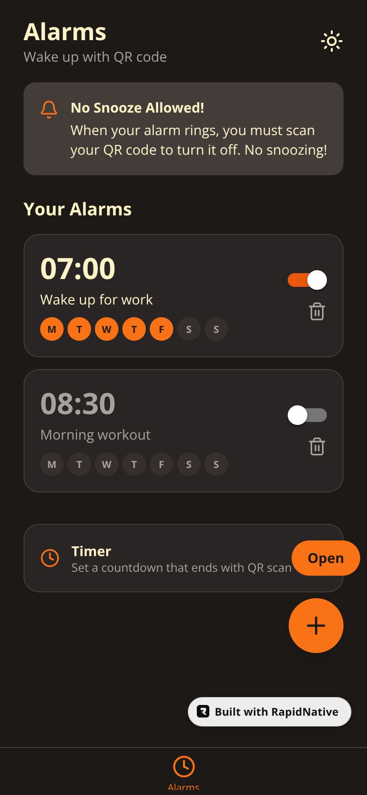 An alarm app that requires scanning a QR code to turn off, ensuring you're fully awake with no snooze option.