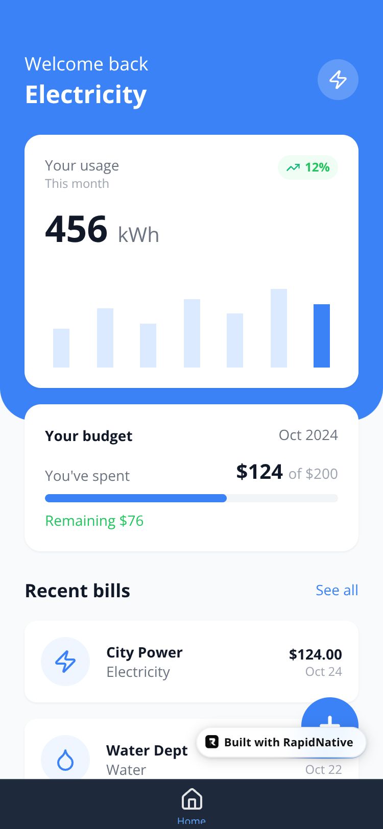 A smart utility bill tracking app that helps homeowners monitor energy usage, set budgets, and track monthly consumption with interactive charts and insights.