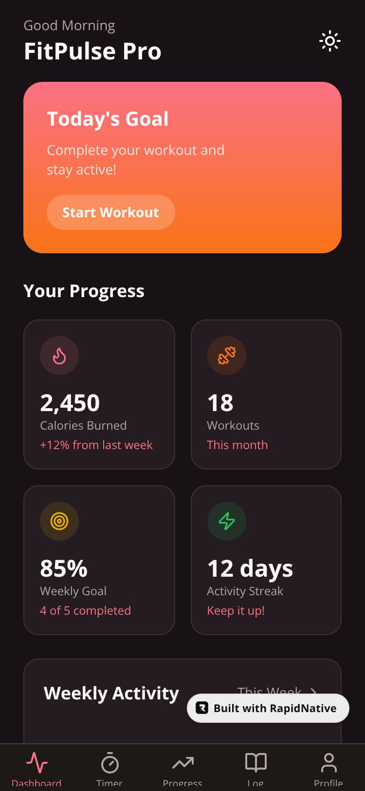 A comprehensive fitness tracking app with workout dashboards, timers, progress monitoring, workout logging, and personalized profiles for achieving fitness goals.