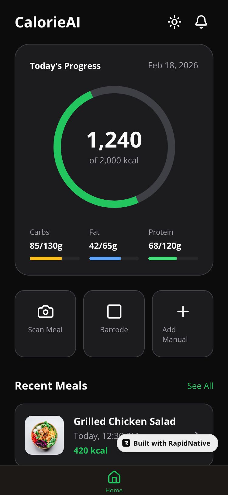 An AI-powered calorie tracking app with smart meal scanning, nutrition analytics, and macro tracking. Features circular progress indicators and intuitive meal logging.