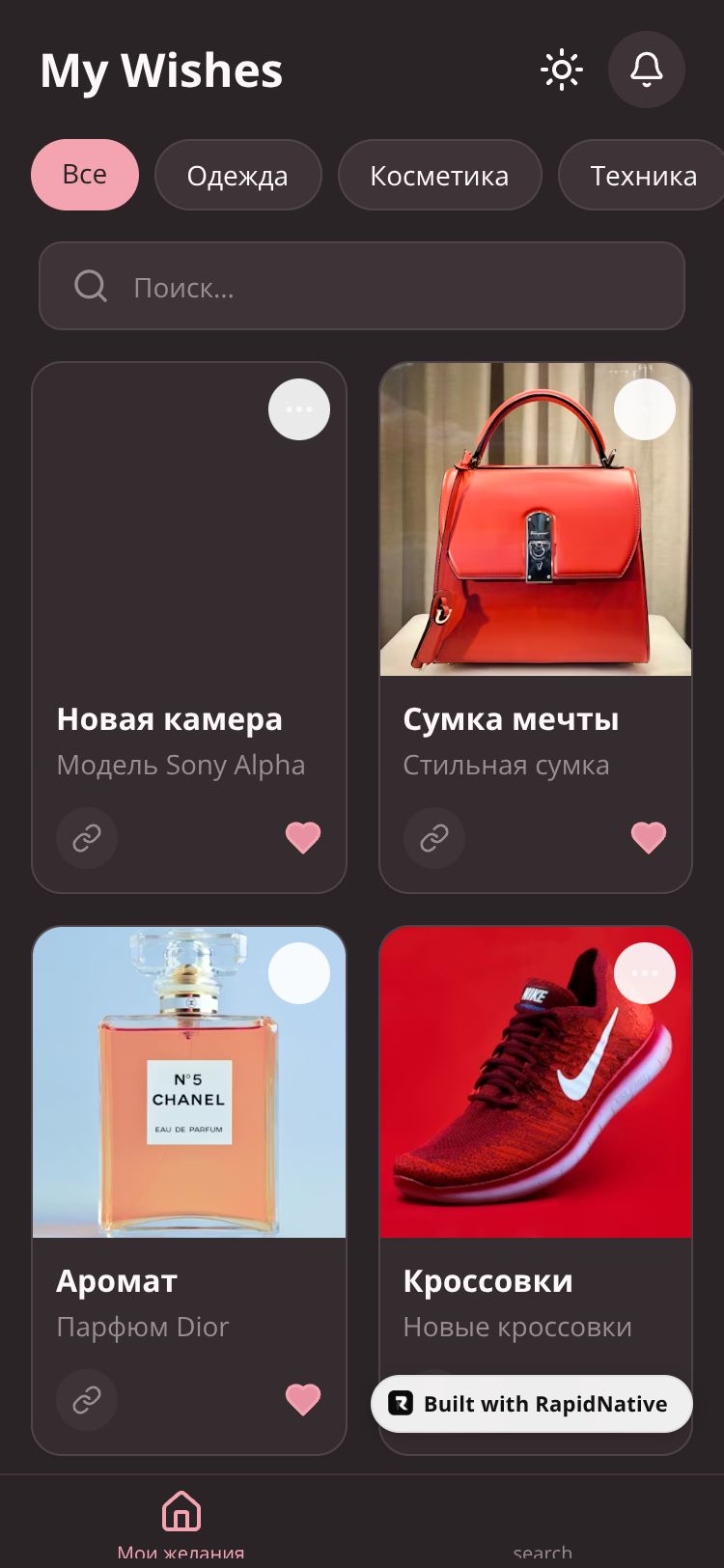 A beautiful wishlist app to save your dreams and desired items. Organize wishes by categories, add photos, descriptions and links to your favorite products.